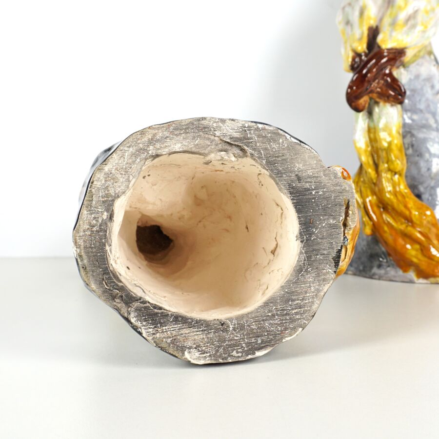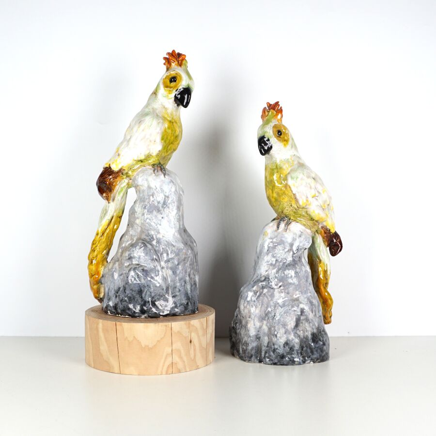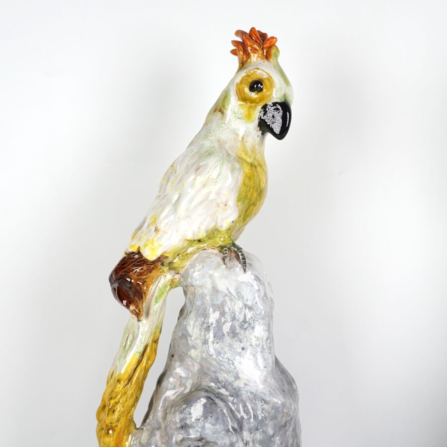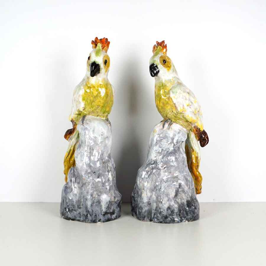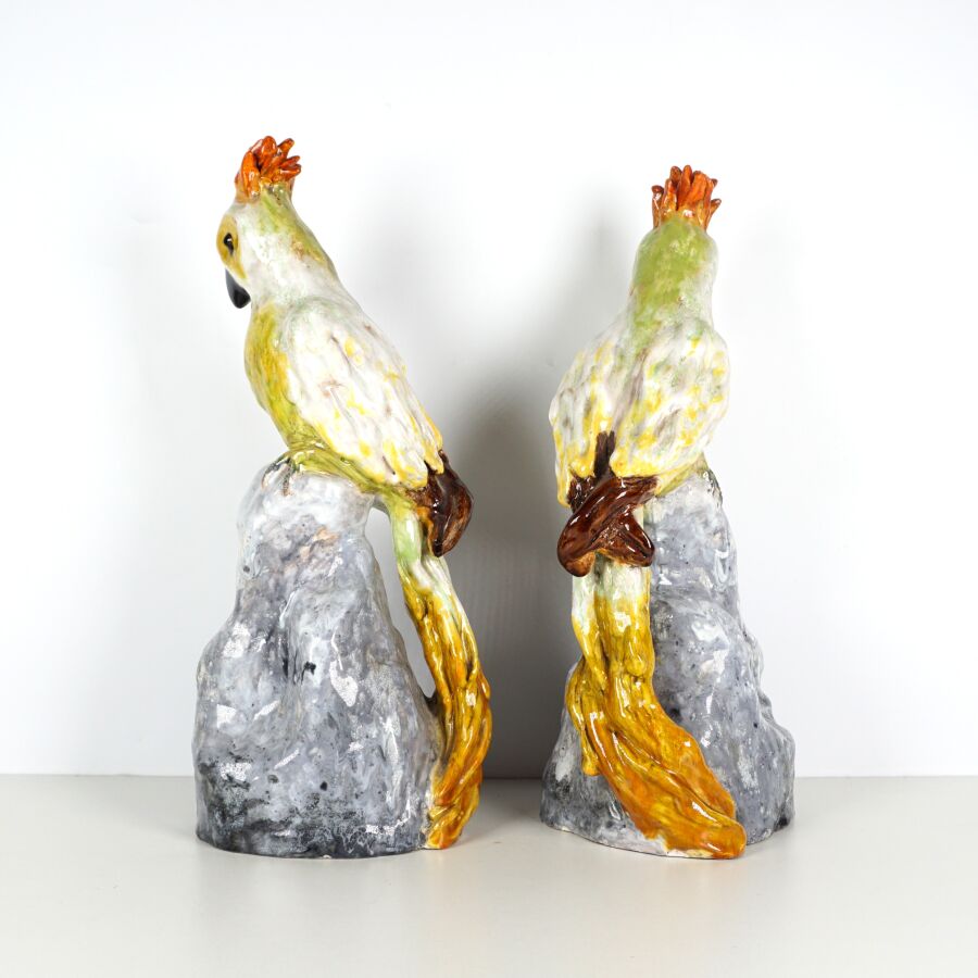 Paire de perruches branchés en céramique émaillée polychrome, H. 38 cm (légers éclats).