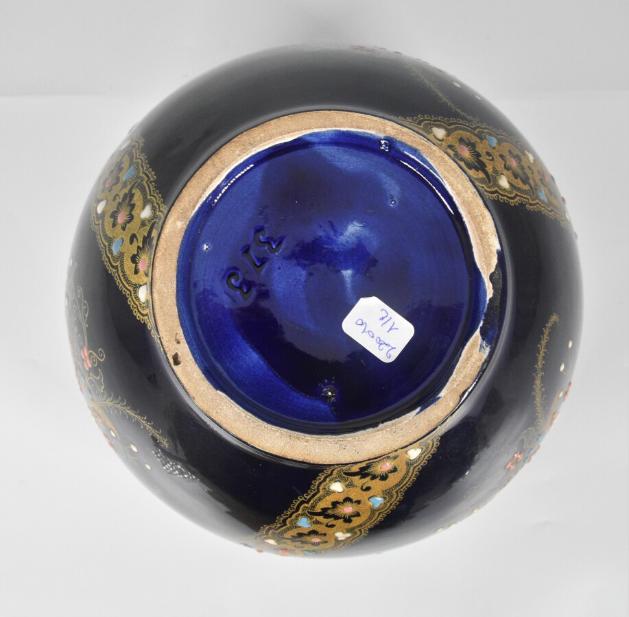 Paire de petites jardinières sur piédouche en faïence à décor émaillé de fleurs et de frises florales sur fond bleu Sèvres, rehauts dorés, H. 24 cm, D. 18 cm (usures).