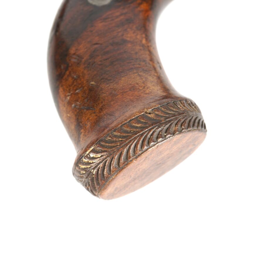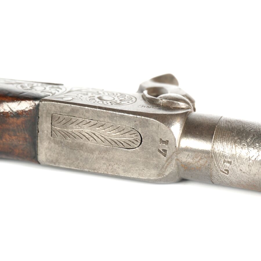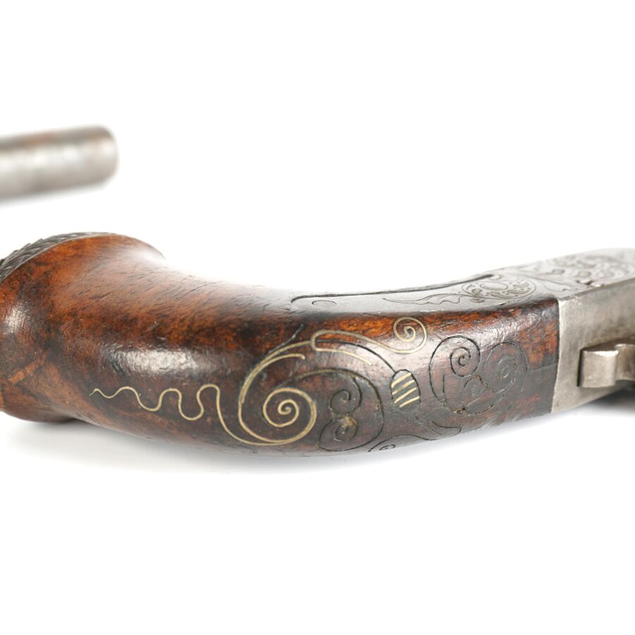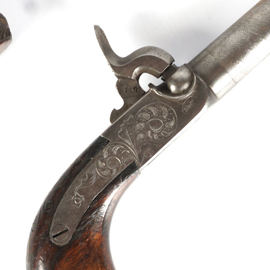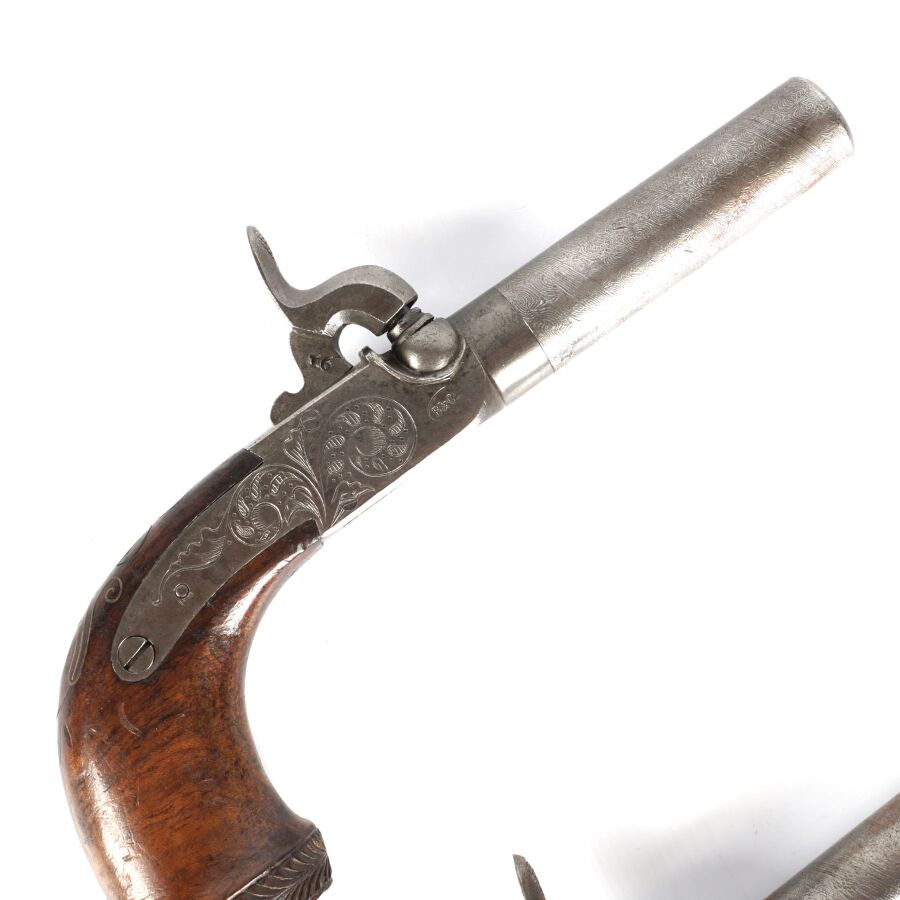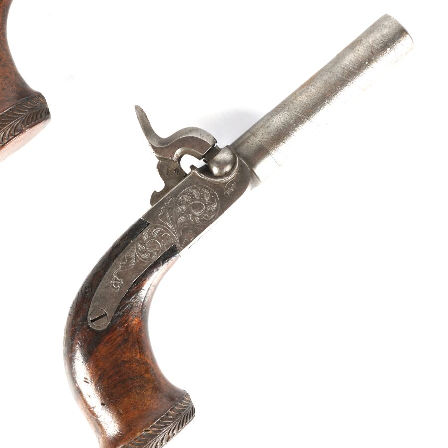 PAIRE DE PISTOLETS A BALLES FORCEES, platines à coffre à percussion à décor gravés de rinceaux feuillagés, canons ronds damassés de 5.5 cm à balles forcées, détentes rentrantes, crosses en noyer en forme de poire avec repose-paume et filets métalliques incrustés, mécanismes semblant fonctionnels, longueur totale : 16.5 cm, vers 1840, BE.