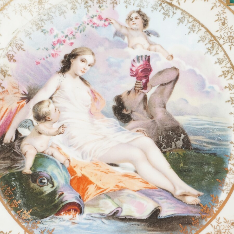 Paire de plats à bords chantournés, porcelaine émaillée polychrome et rehauts d'or, le bassin orné de peintures d'après François BOUCHER (1703-1770), Diam : 29 cm et 28.5 cm.