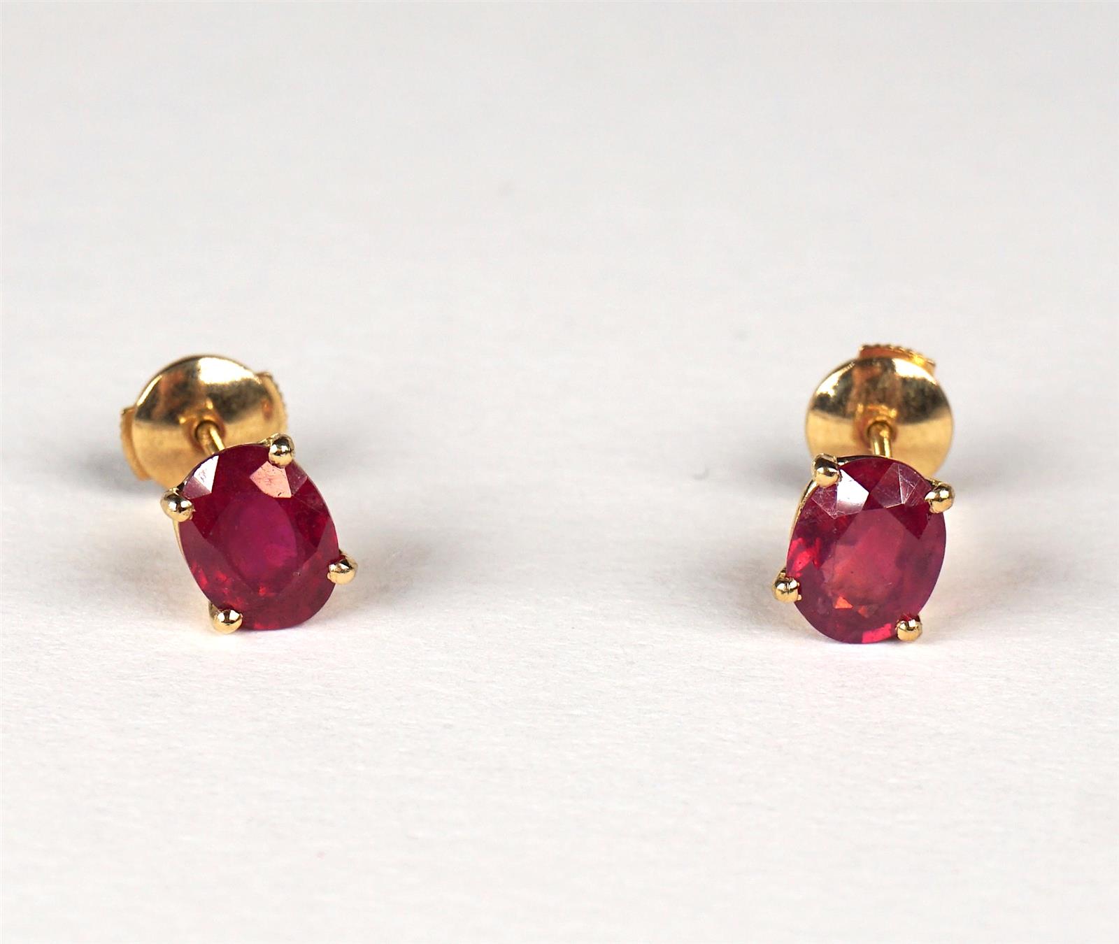 Paire de pointes d'oreilles en or jaune 18 K (750/oo) sertie chacune d'un rubis traité taille ovale, pesant ensemble 3,25 cts. Poids brut : 2.1 g environ.