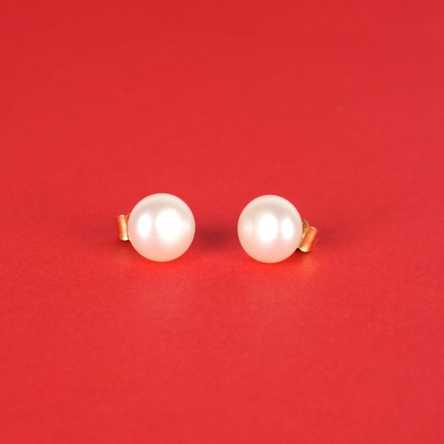 Paire de pointes d'oreilles en or jaune 18K (750/oo) serties chacune d'une perle (Diam. 1 cm), Poids brut : 2.3 g environ (infimes usures peu visibles à l'oeil nu).