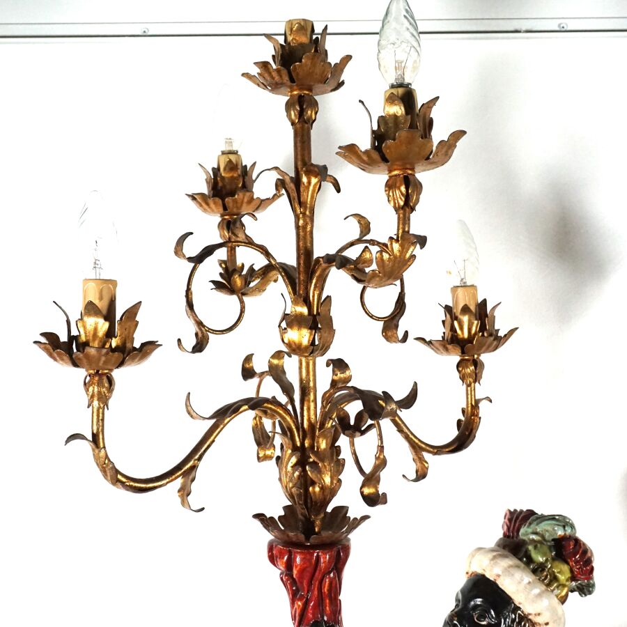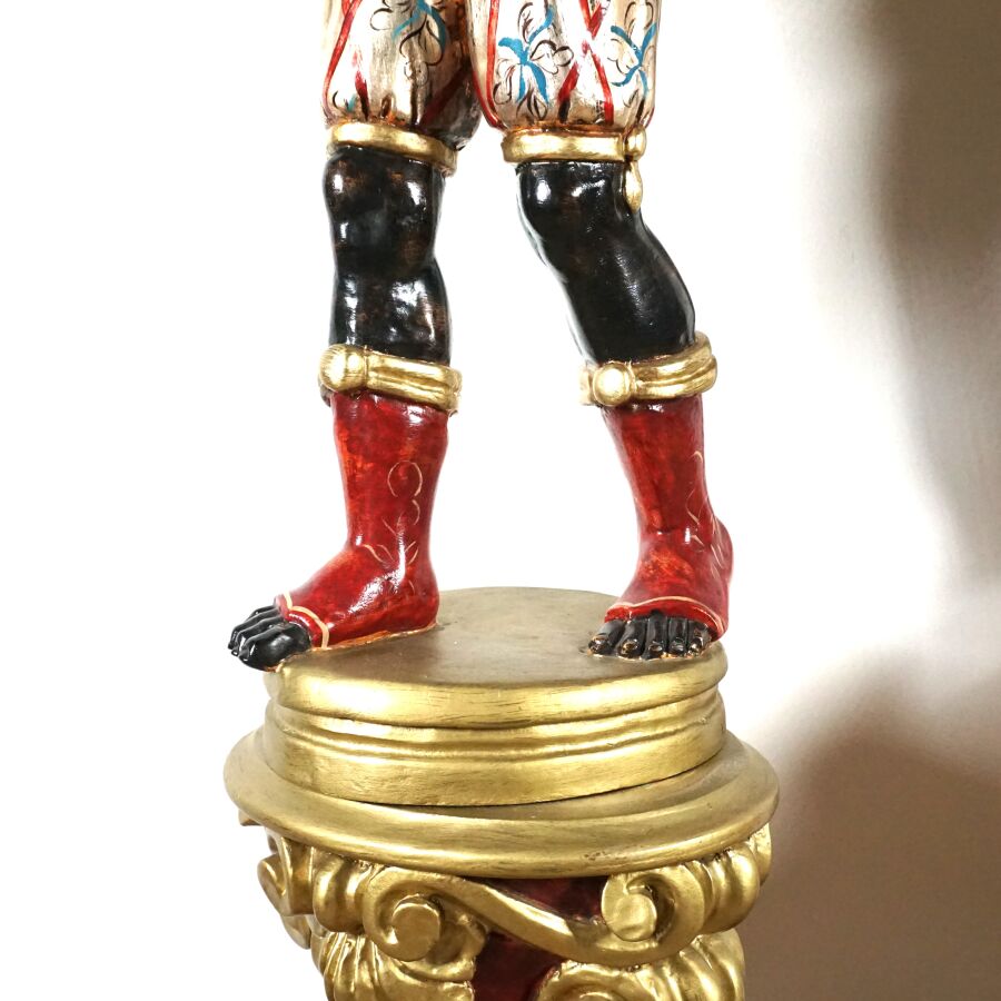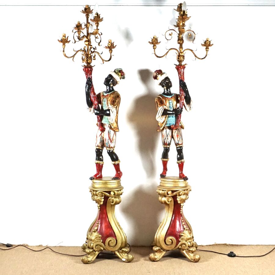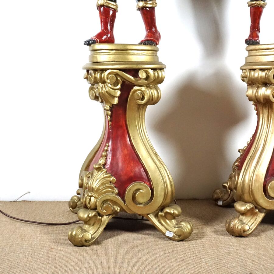 Paire de porte-torchères en bois polychrome et rehauts d'or figurant deux nubiens portant une corne d'abondance terminant par une torchère à cinq bras à motif feuillagé, H. 190 cm.