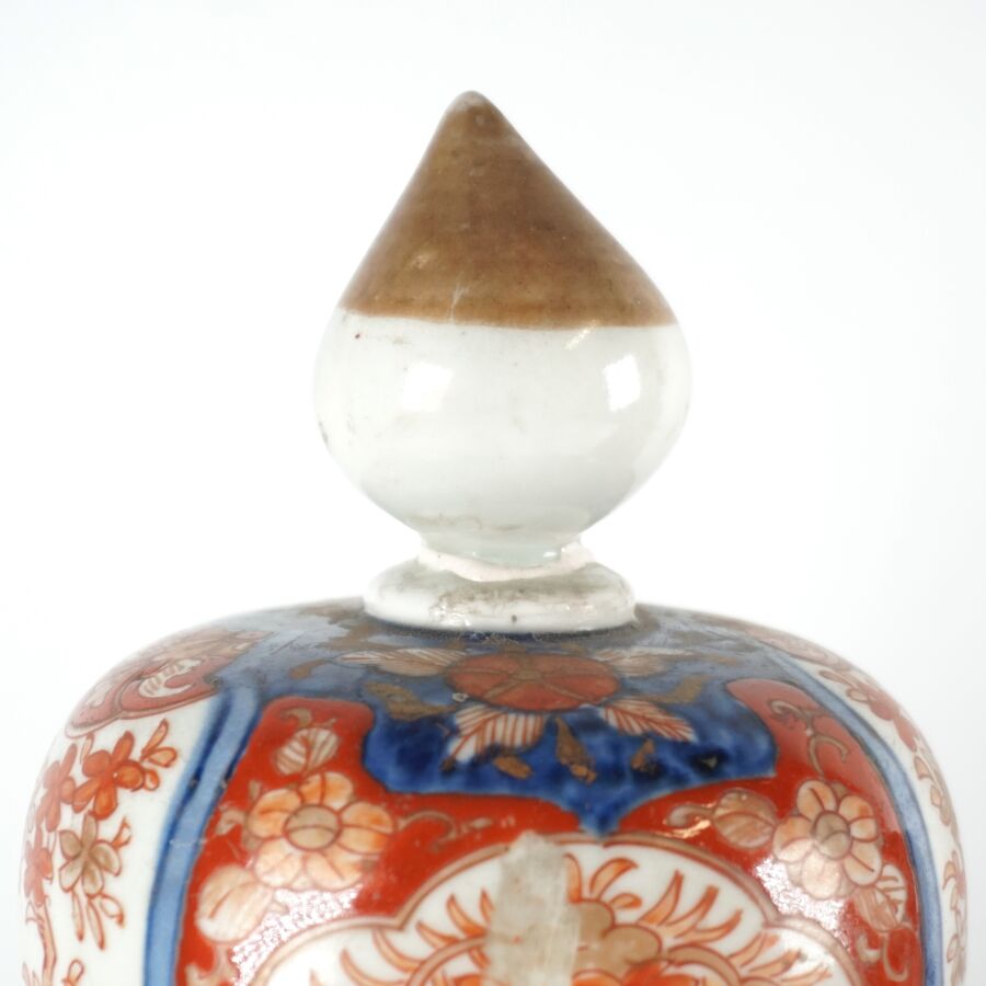 Paire de potiches couvertes, porcelaine émaillée dite d'Imari, à décor bleu, corail et rehauts d'or de chariots de mariage et compositions florales, période Taisho, circa 1920, Japon, H. 40 cm (restaurations aux prises, petites usures à l'émail et à la dorure).