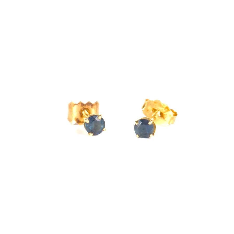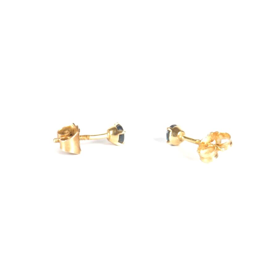 Paire de puces d'oreille en or jaune 18K (750/oo), serties griffe d'un petit saphir bleu de forme ronde (D. 4 mm), fermoir poussettes à vis, Poids brut : 0.7 g environ.