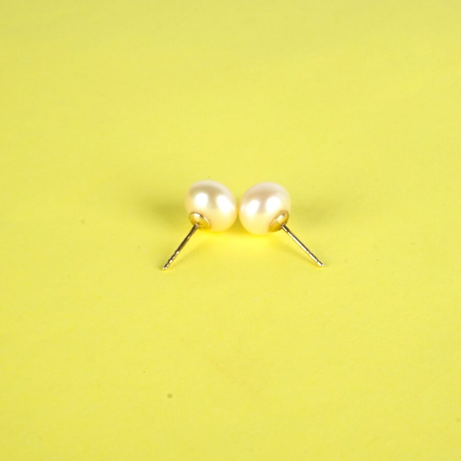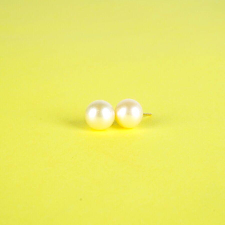 Paire de puces d'oreilles en or jaune 14K (585/oo), serties chacune d'une perle blanche (D. 9 mm), Poids brut : 1.8 g environ (sans fermoirs).