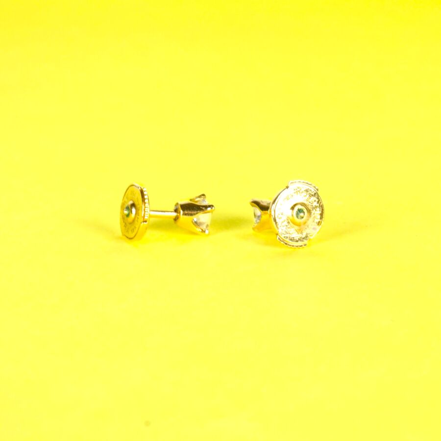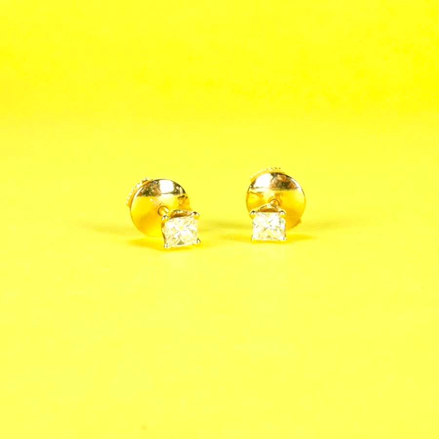 Paire de puces d'oreilles en or jaune 18K (750/oo), serties quatre griffes d'un diamant taille princesse calibrant 0.35 cts environ chaque (D. 3.5 x 3.8 mm), fermoir alpa en or jaune 18K (750/oo), Poids brut : 1.7 g environ.