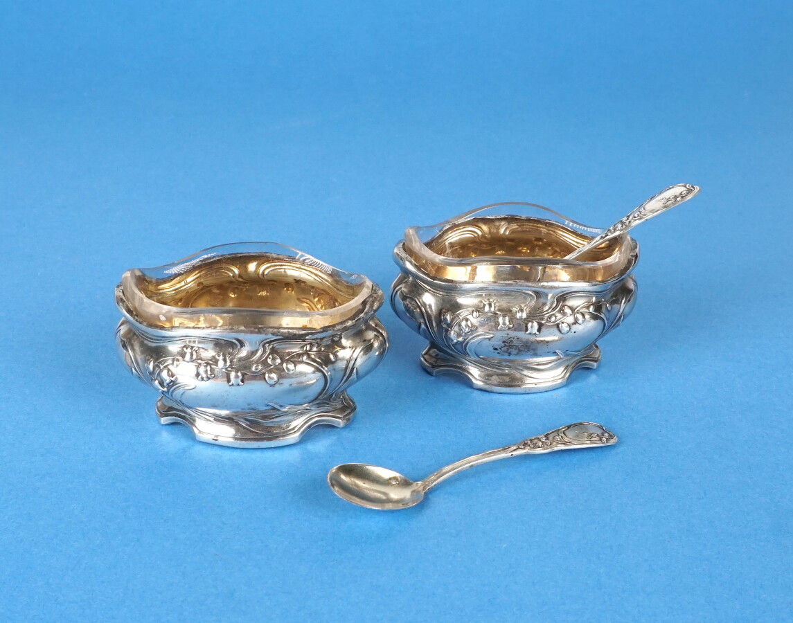 Paire de salerons ovales et 2 cuillères à sel en argent, poinçon Minerve, à décor de muguet, les verrines en verre, L. 6.3 cm, H. 3.5 cm. Poids brut argent : 45 g environ.