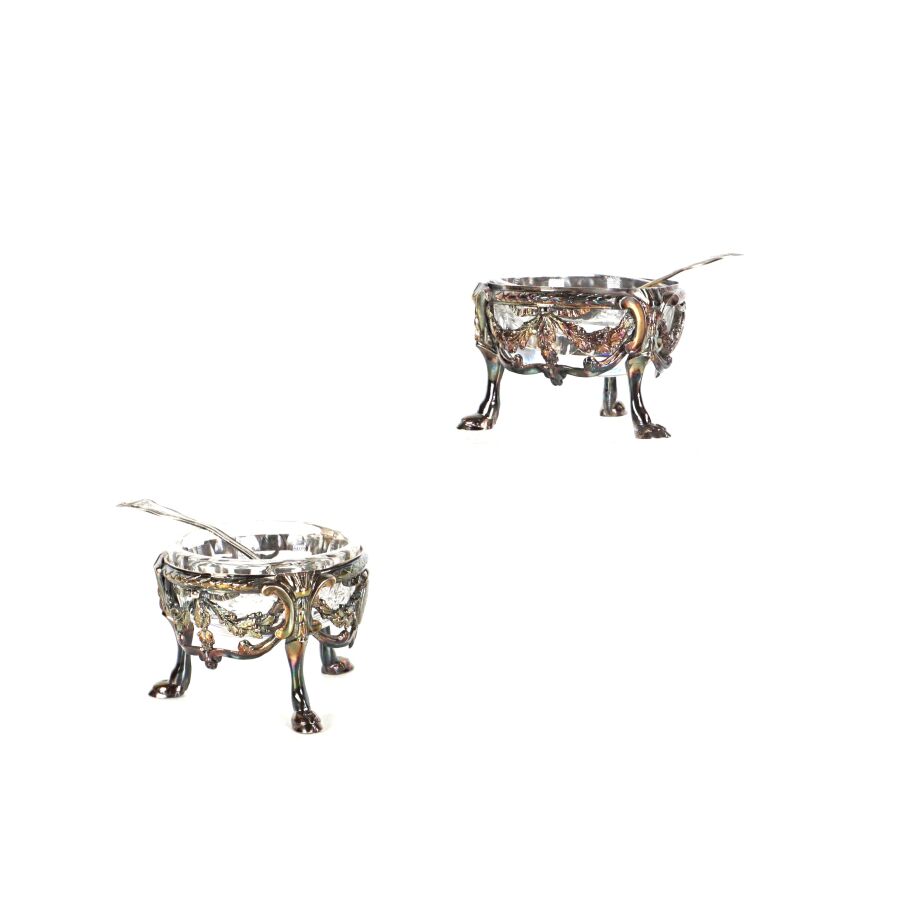 Paire de salières en argent (800/oo), piétement tripode à motif de sabots et à décor de guirlandes végétales et de noeud, avec leurs verrines en verre incolore, et deux cuillères en argent, poinçon Minerve 1er titre (rapportées), Poids brut : 334 g environ. Poids (hors verrines) : 158 g environ.