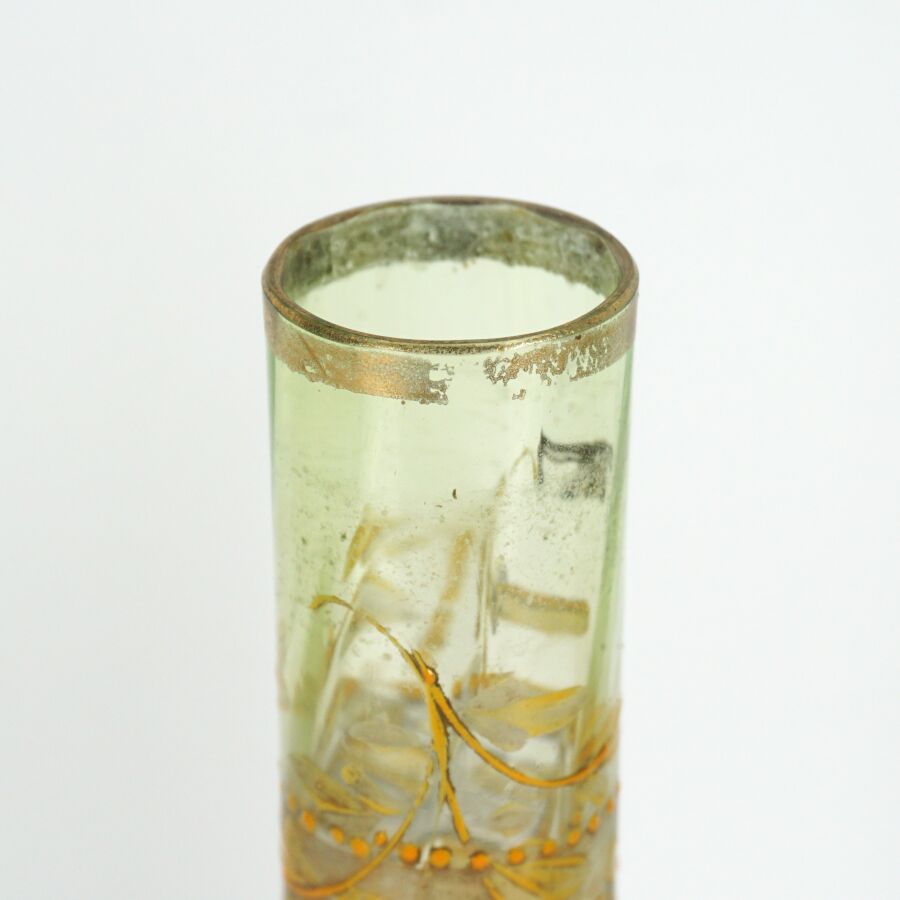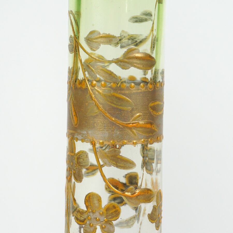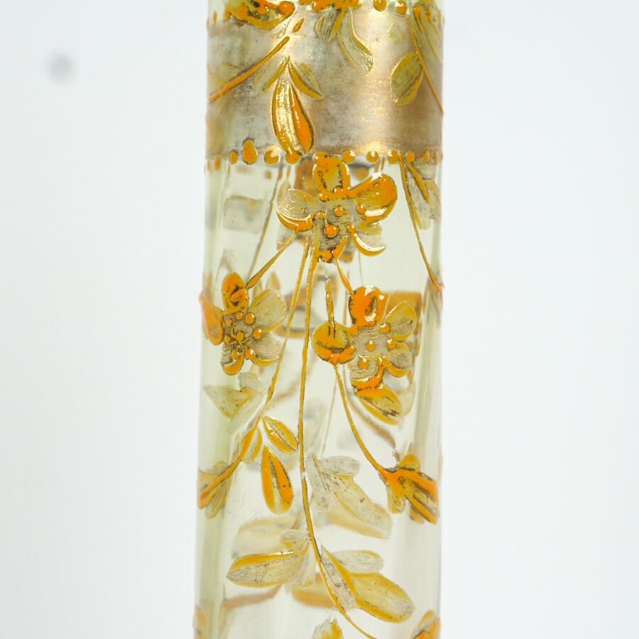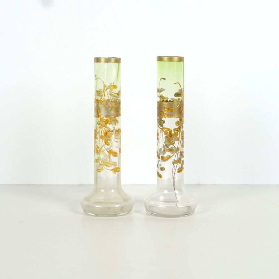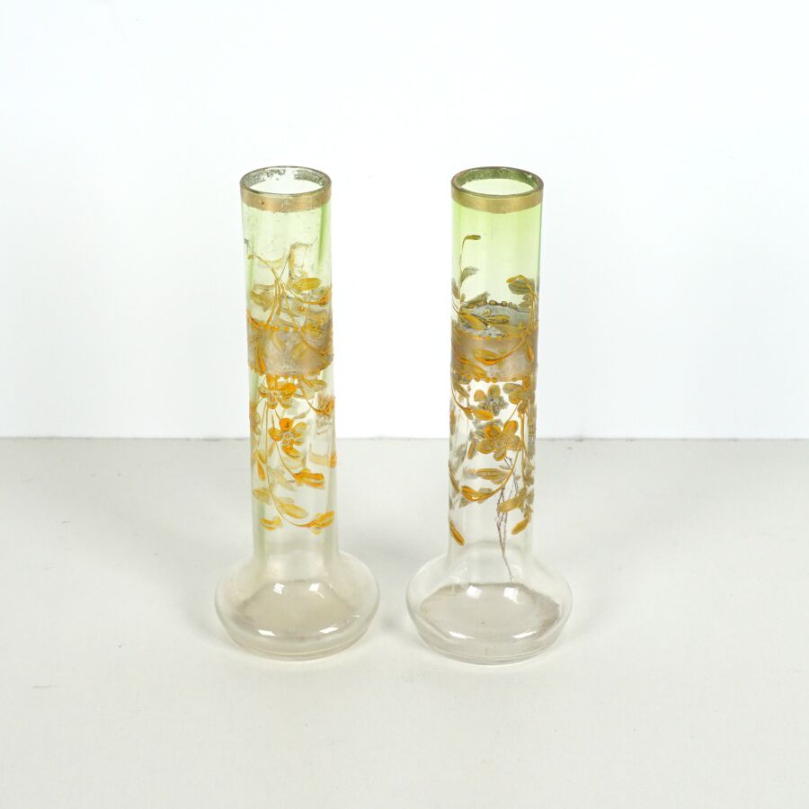 Paire de soliflores en verre partiellement teinté vert à décor de fleurs jaunes, H. 15,5 cm (usures au décor).