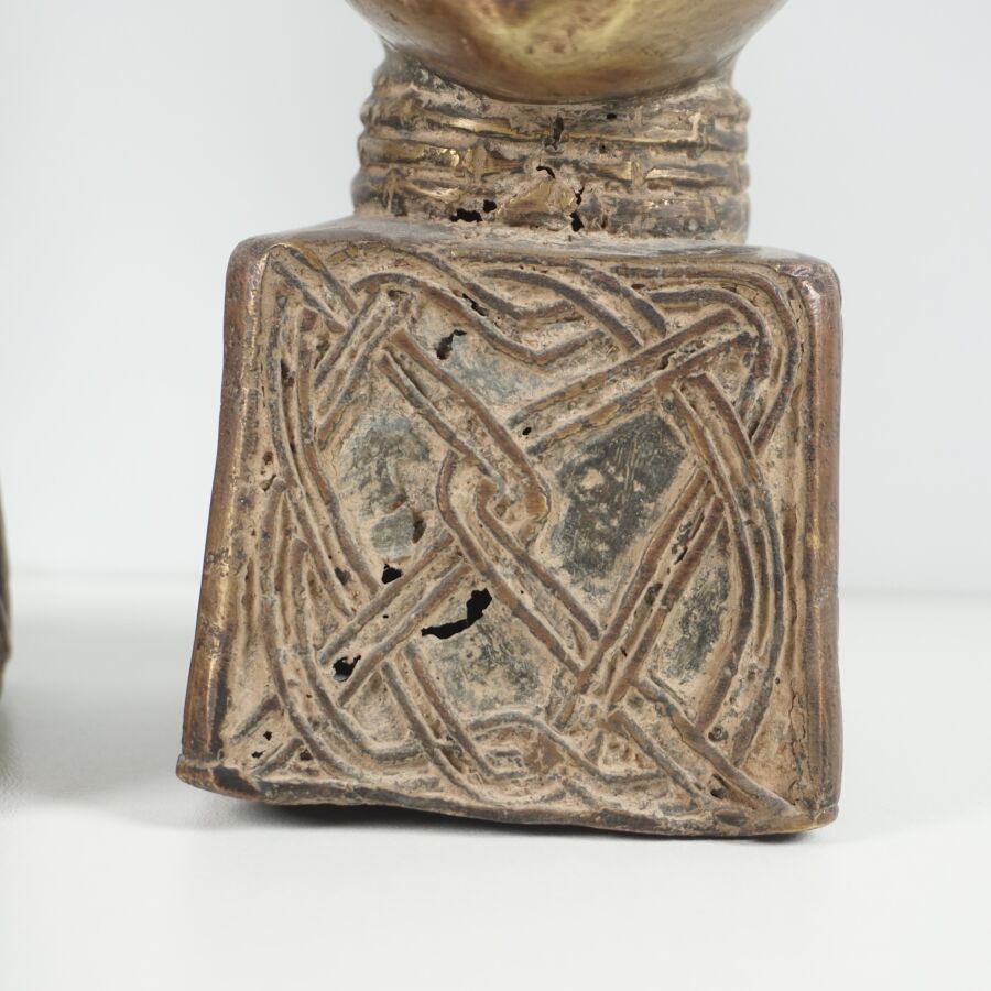 Paire de statuettes, métal doré, figurant deux visages coiffés, Afrique, travail décoratif moderne, H. 30 cm (usures).