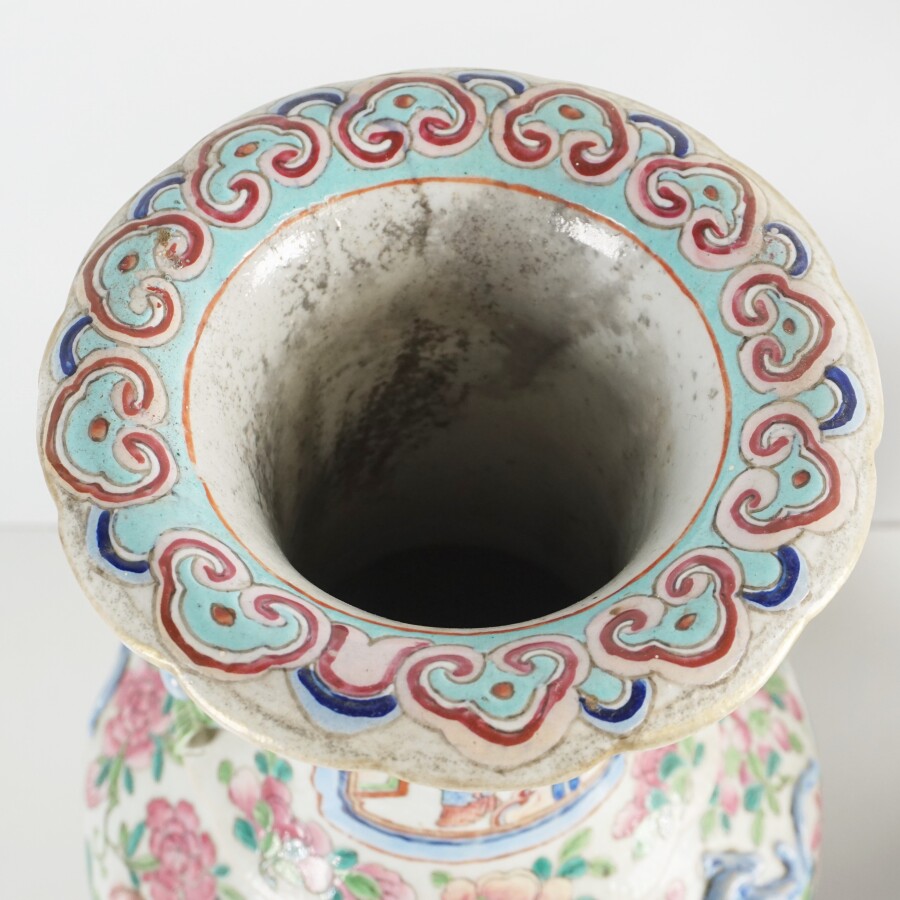 Paire de vases à corps pansu et à col évasé, porcelaine et émaux dans le goût de la famille rose, à décor de scènes de théâtre et de divertissement, dragons, salamandres et chimères ornant la base du col, Chine, Canton, fin du 19ème siècle, H. 31 cm.