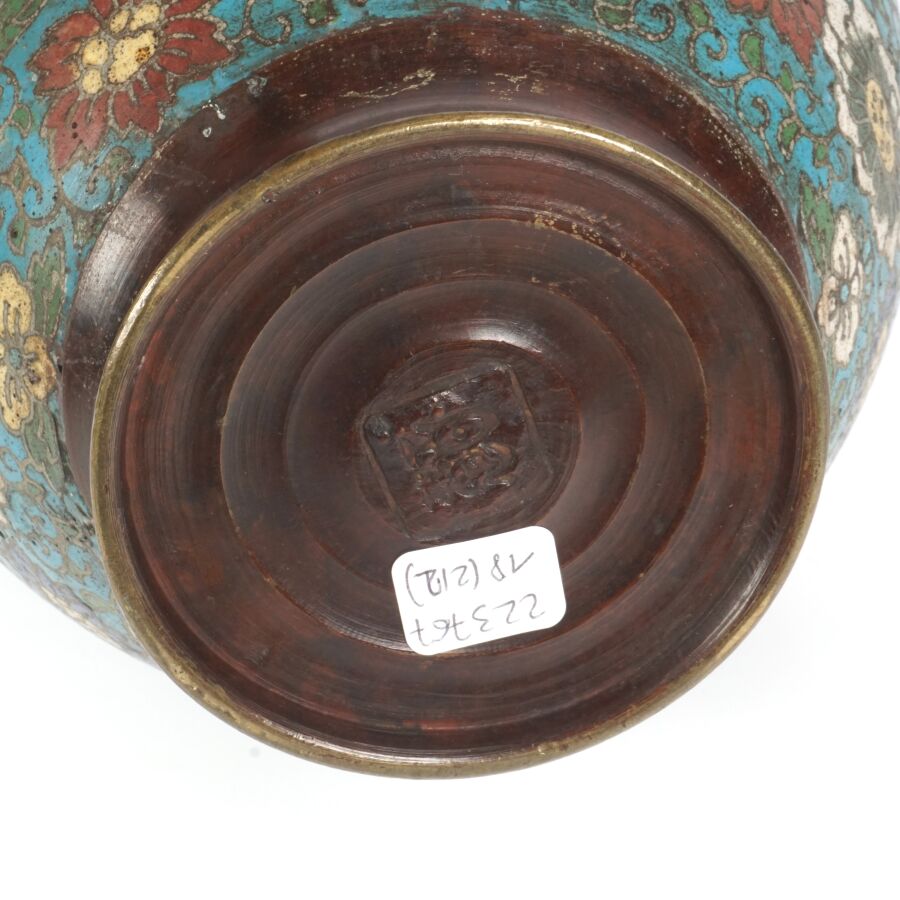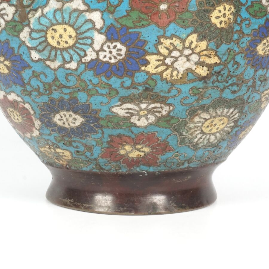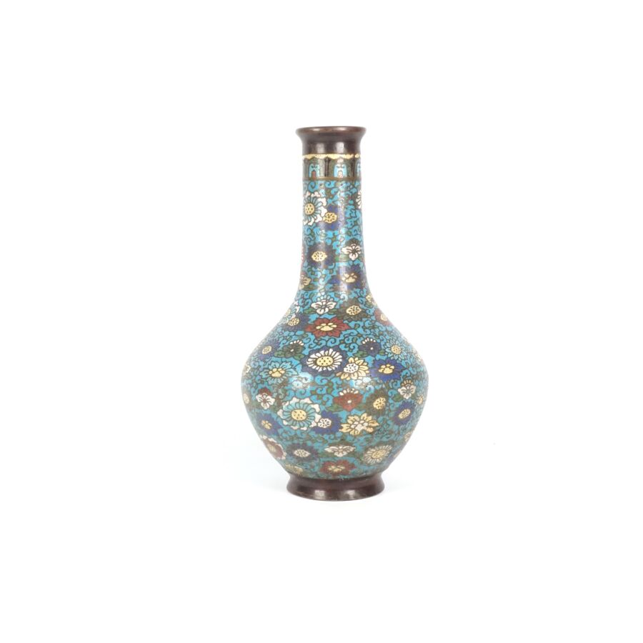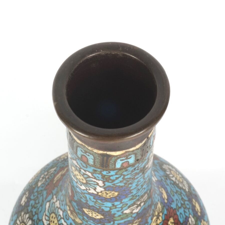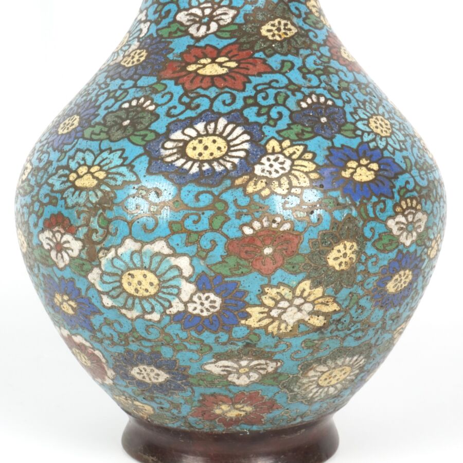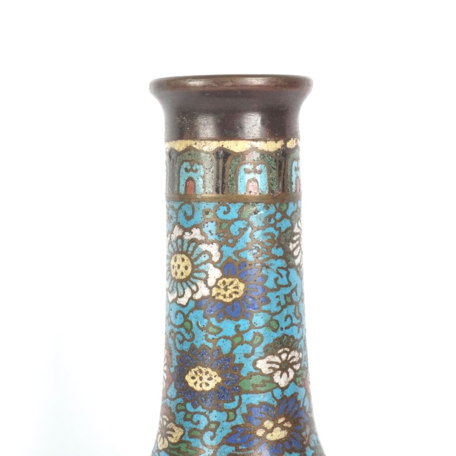Paire de vases balustres à long col, en émaux cloisonnés sur cuivre, à décor de fleurs polychromes sur fond bleu, Chine vers 1920, H. 34 cm (petits manques).