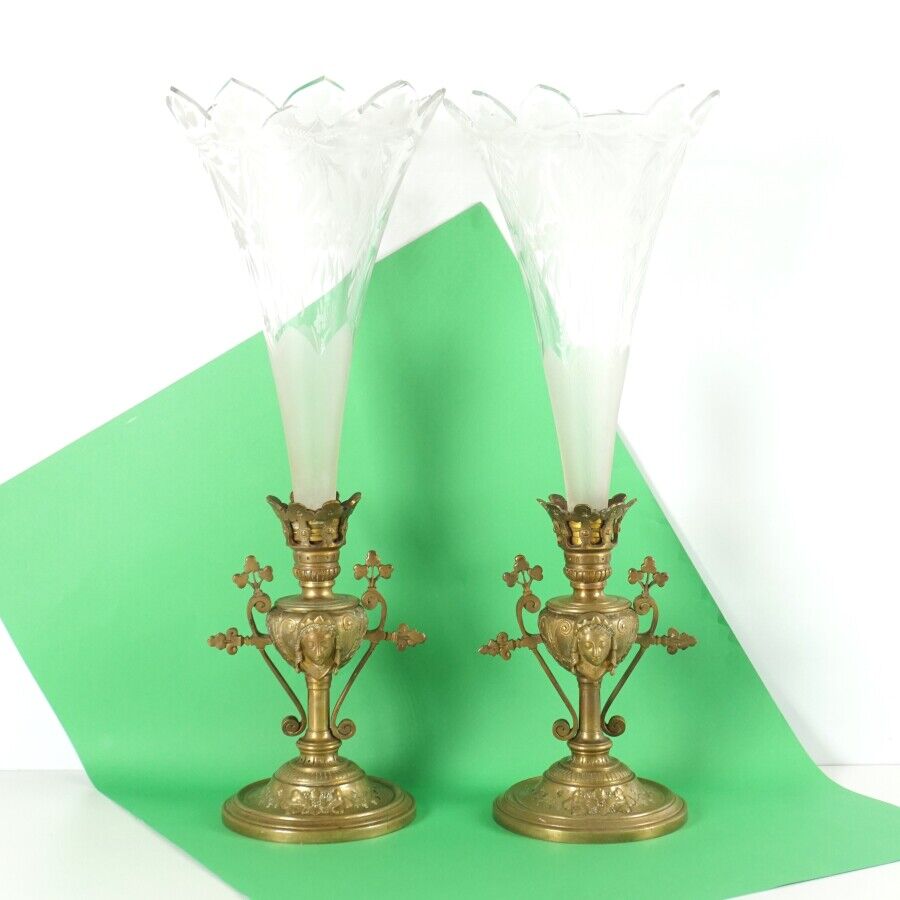 Paire de vases cornets, cristal et laiton, le piètement piédouche à décor de mascarons de femmes et de fleurs, la basque en cristal à décor partiellement sablé de fleurs et végétaux, H. 44.5 cm (accidents et éclats aux cornets).