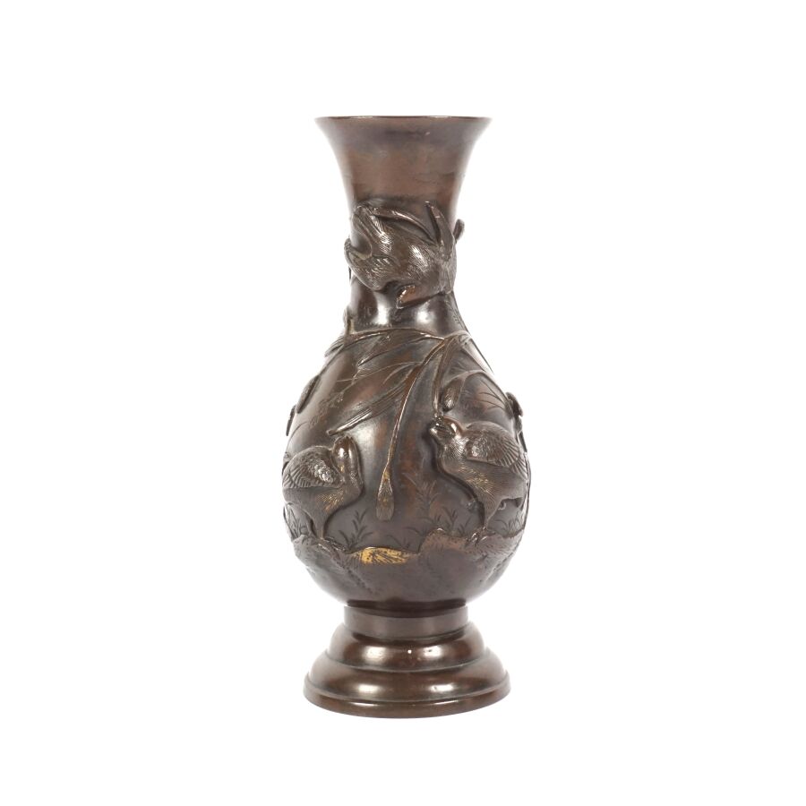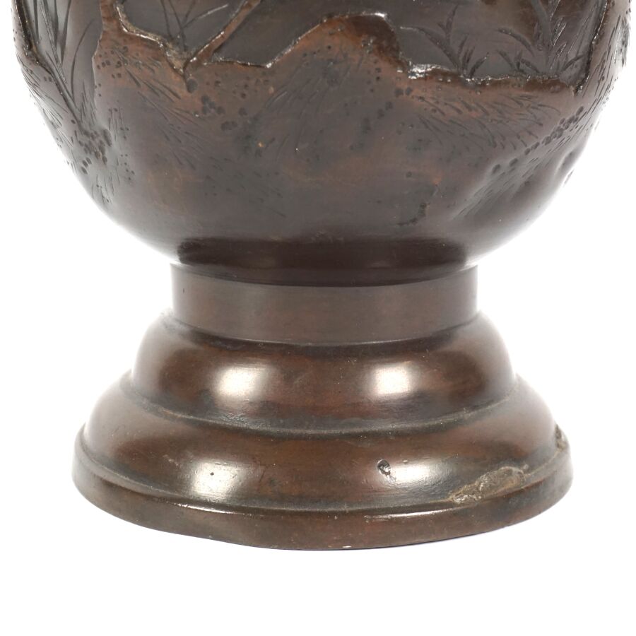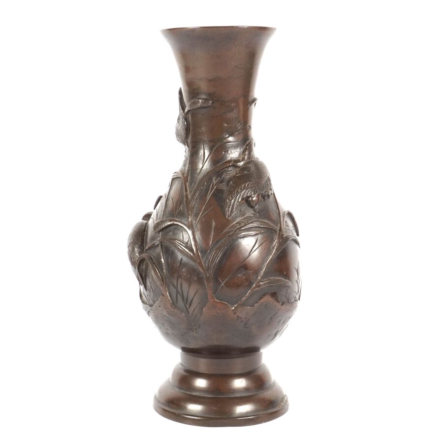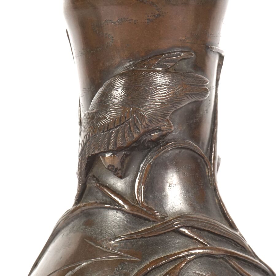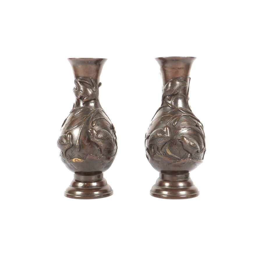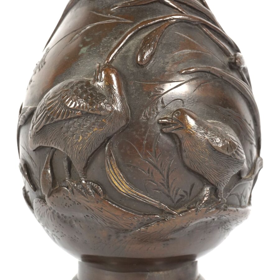 Paire de vases de forme balustre en bronze de belle patine brune à décor tournant en haut relief de cailles parmi des hautes herbes, période Meiji, Japon, H. 24,5 cm.
