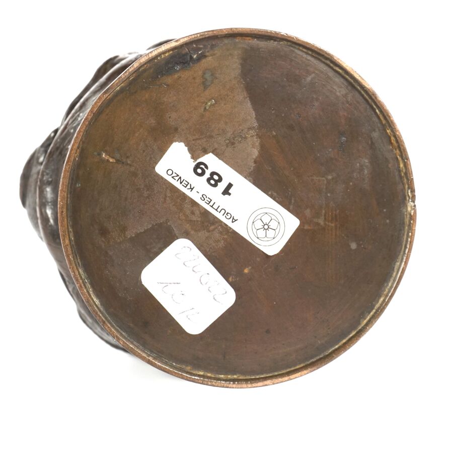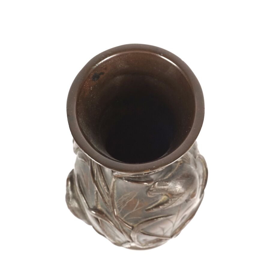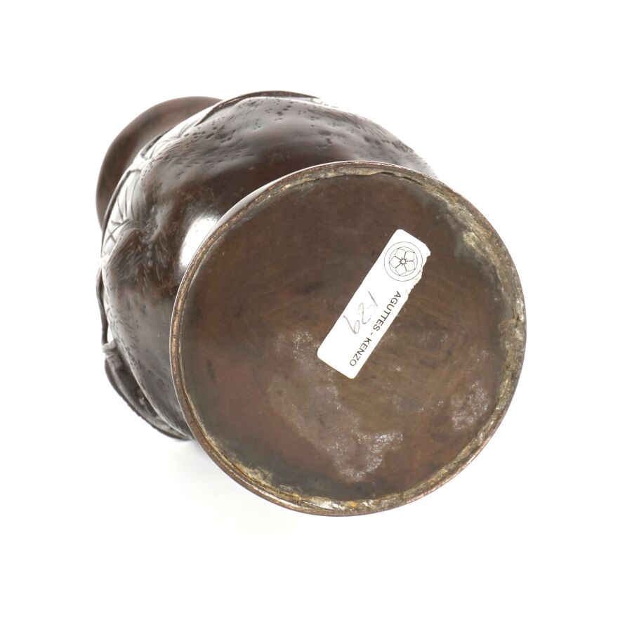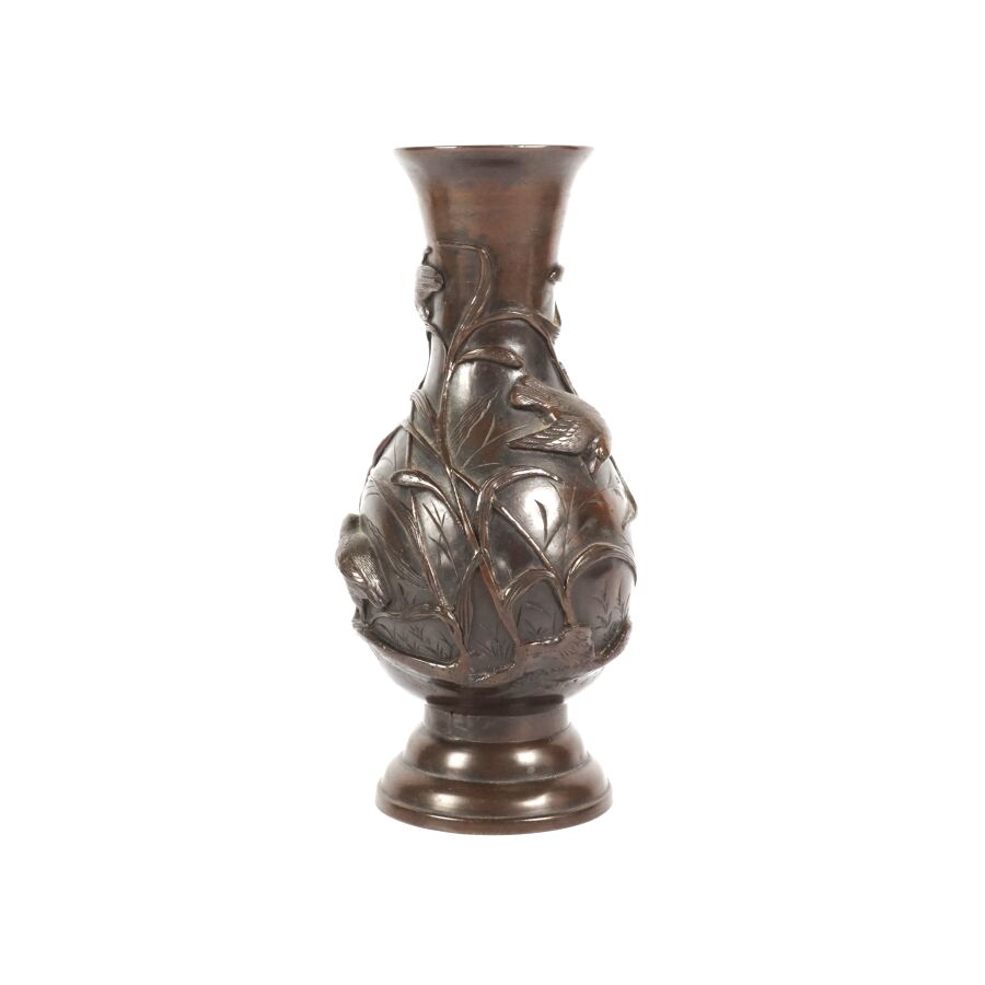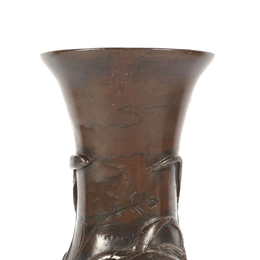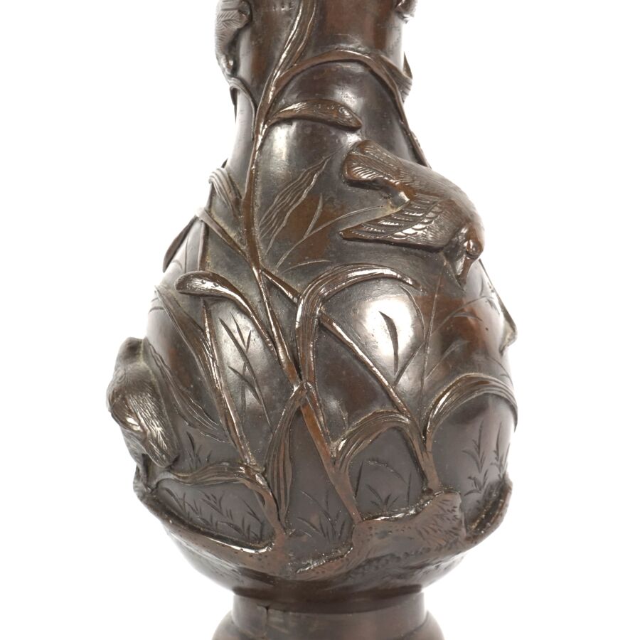 Paire de vases de forme balustre en bronze de belle patine brune à décor tournant en haut relief de cailles parmi des hautes herbes, période Meiji, Japon, H. 24,5 cm.