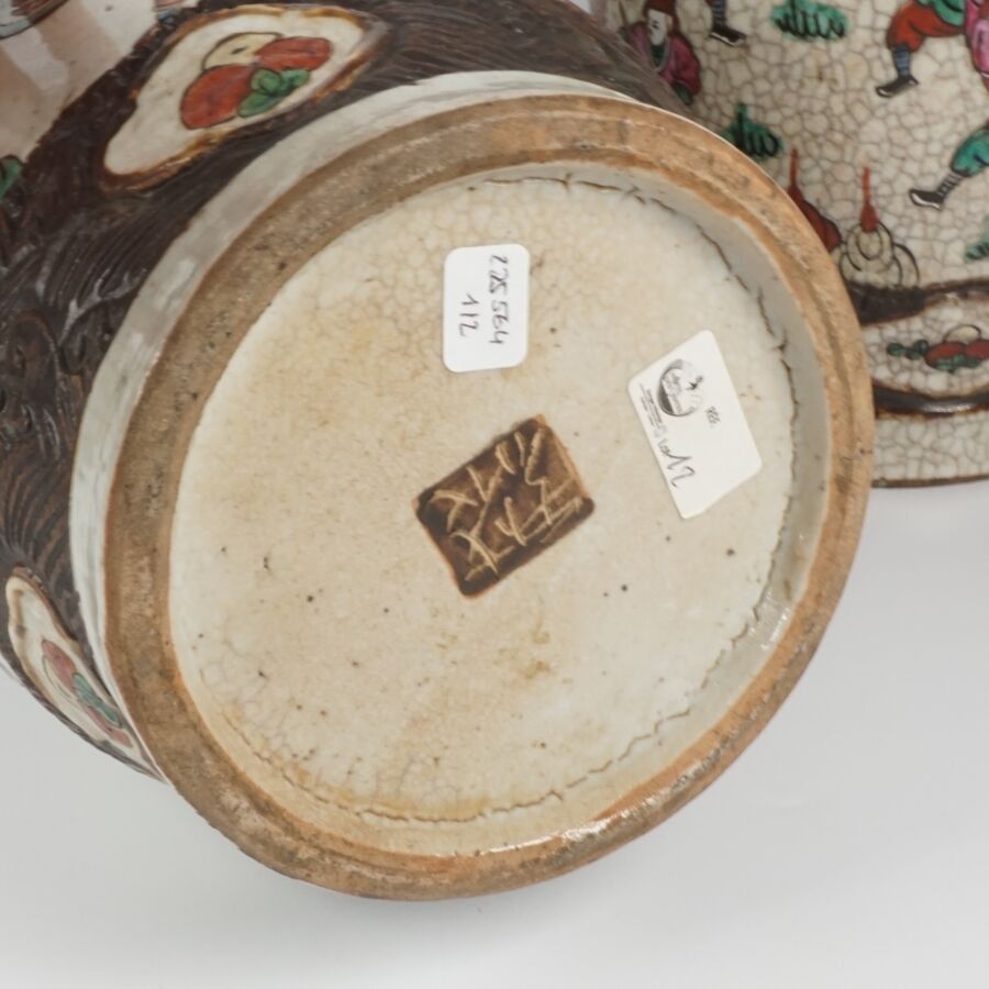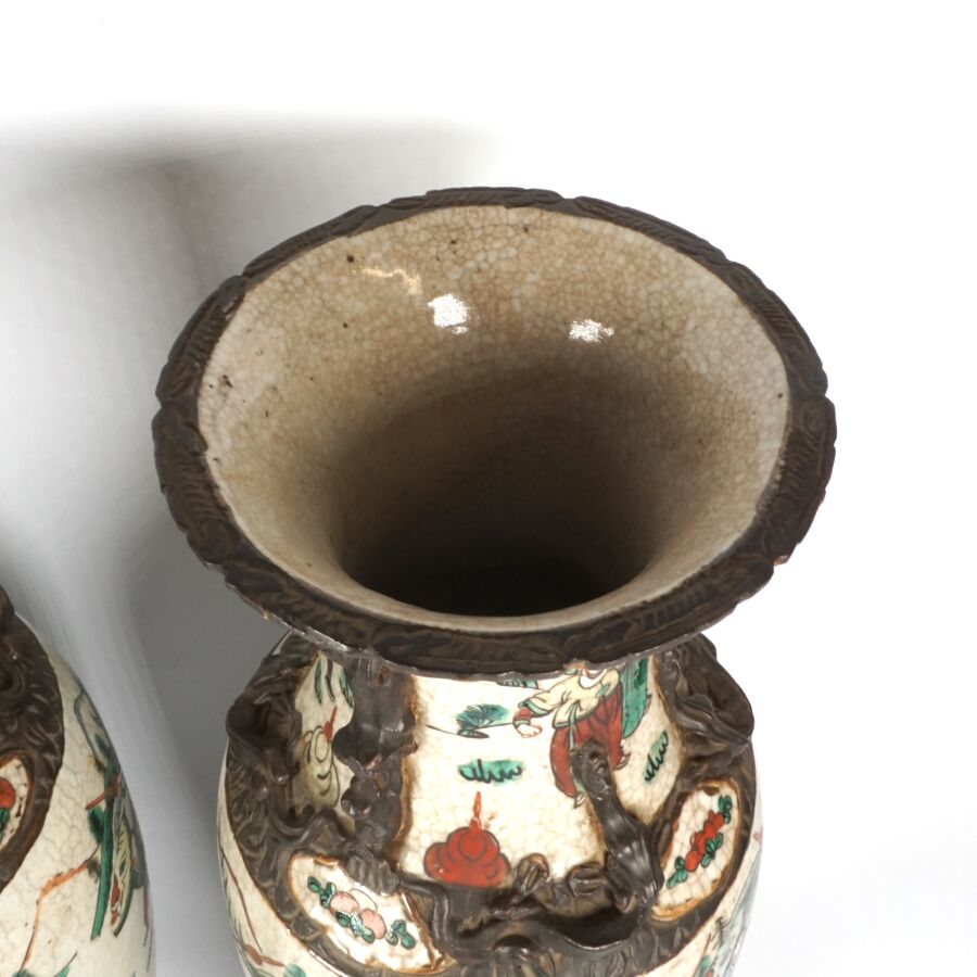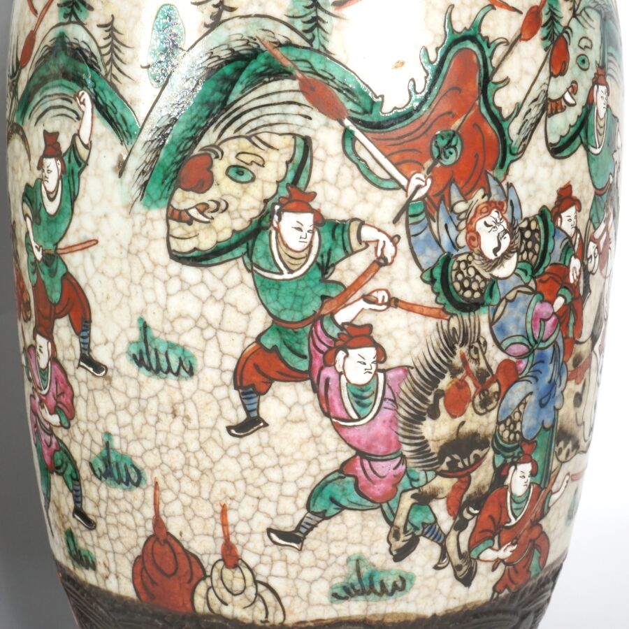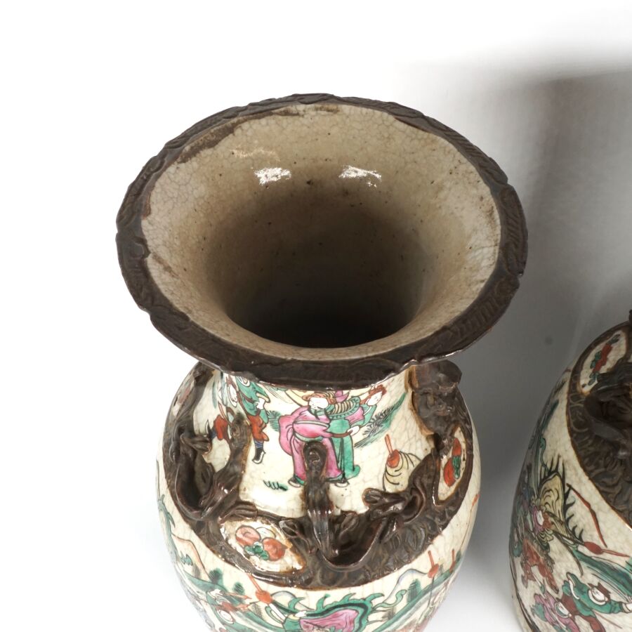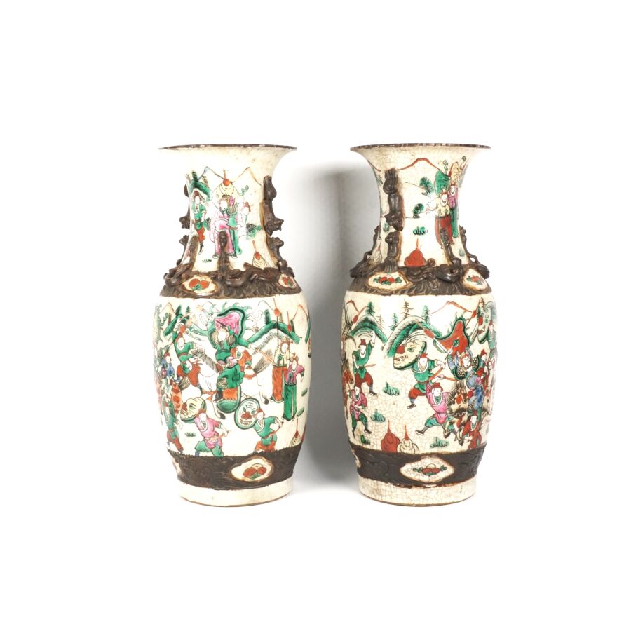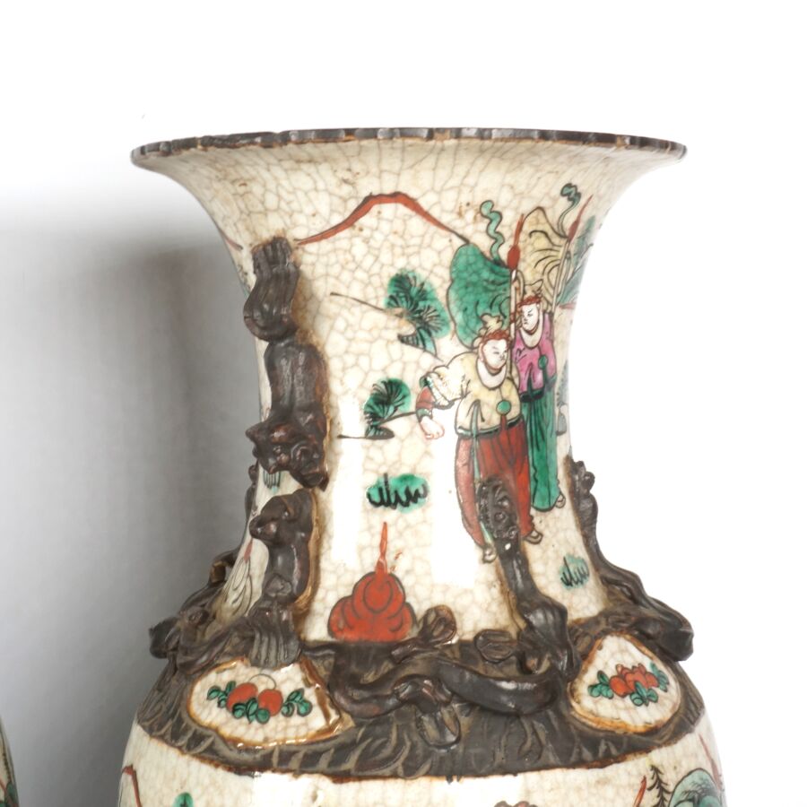 Paire de vases de forme balustre, en porcelaine émaillée polychrome, à décor de guerriers et scènes de batailles, les cols ornés de lions bouddhiques et chilongs, Nankin, Chine, fin du 19ème siècle H. 45 cm.