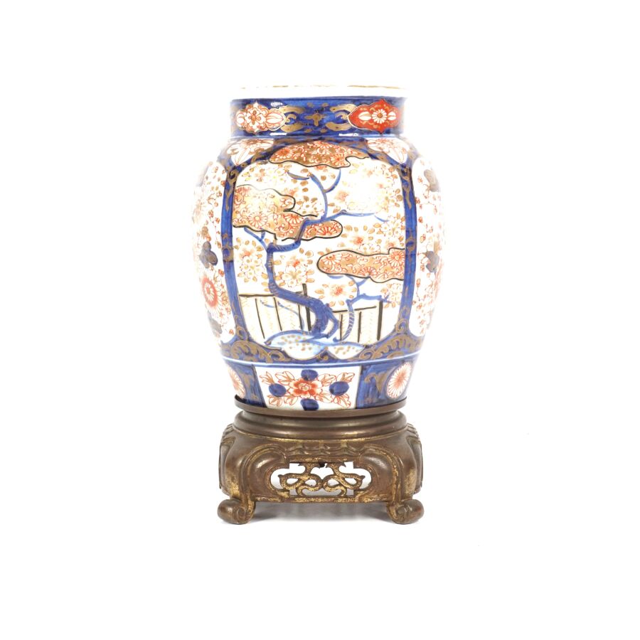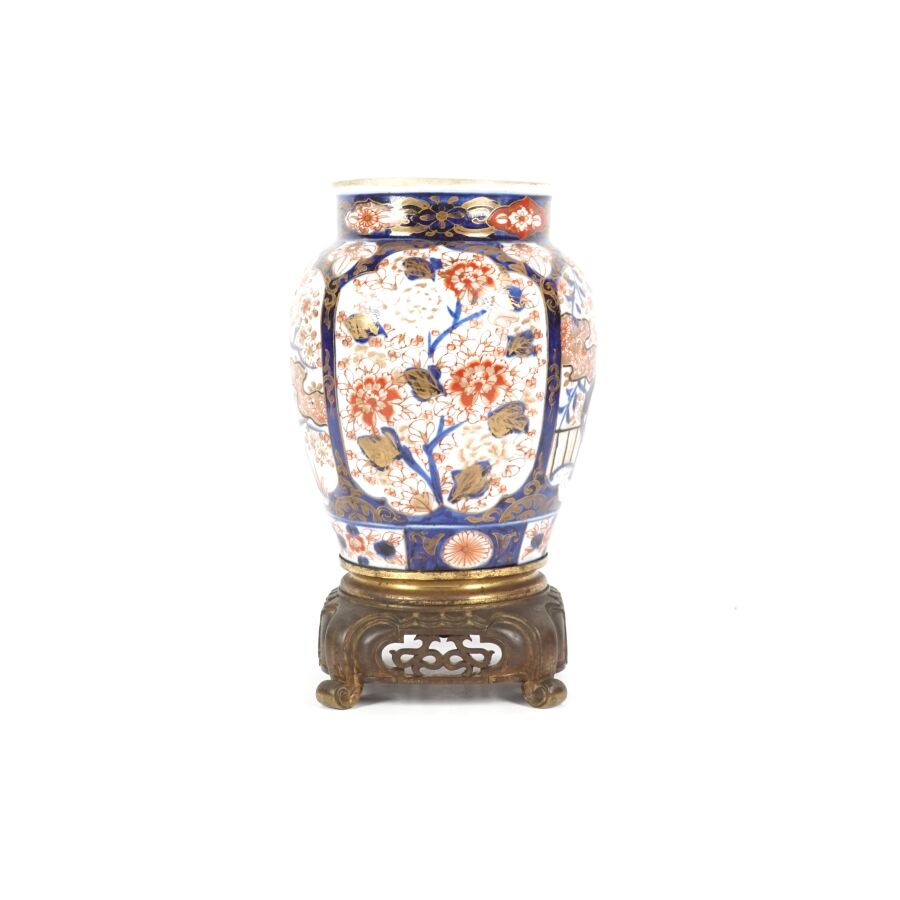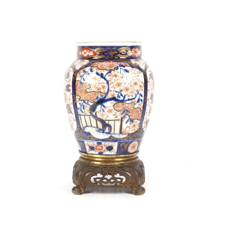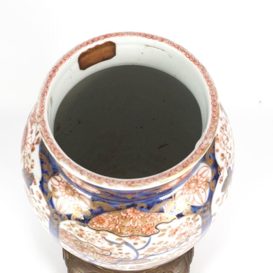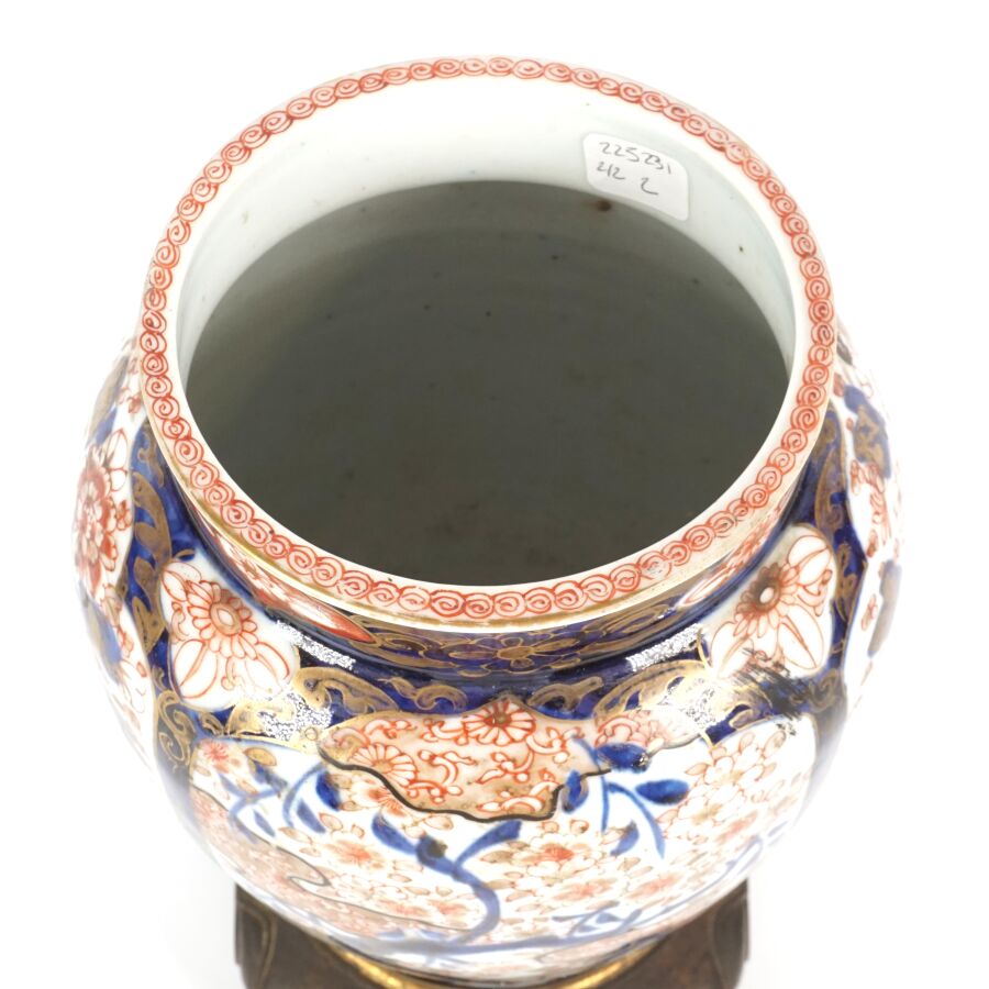 Paire de vases de forme balustre en porcelaine émaillée dite "Imari", à décor en bleu, corail et rehaut d'or, représentant des arbustes en fleurs et des compositions florales, montés sur des bases en bronze à patine brune de style européen, Japon, circa 1980, H. 27 cm (fond percé).