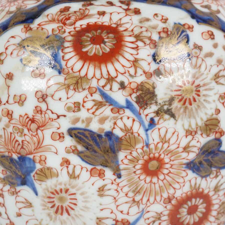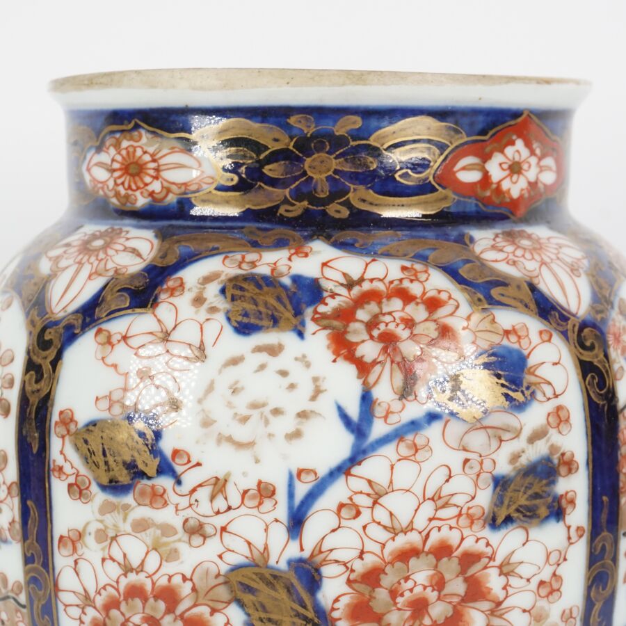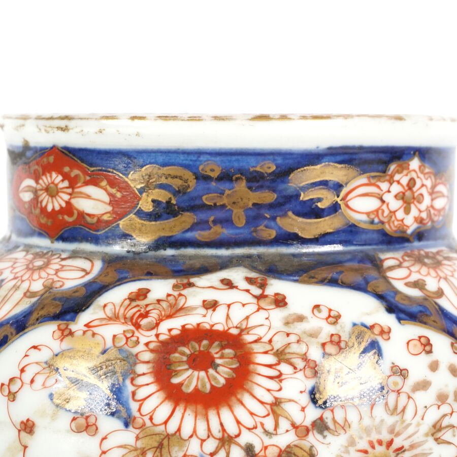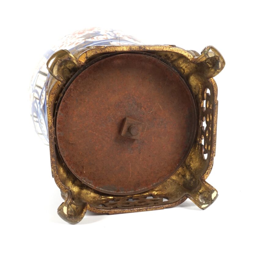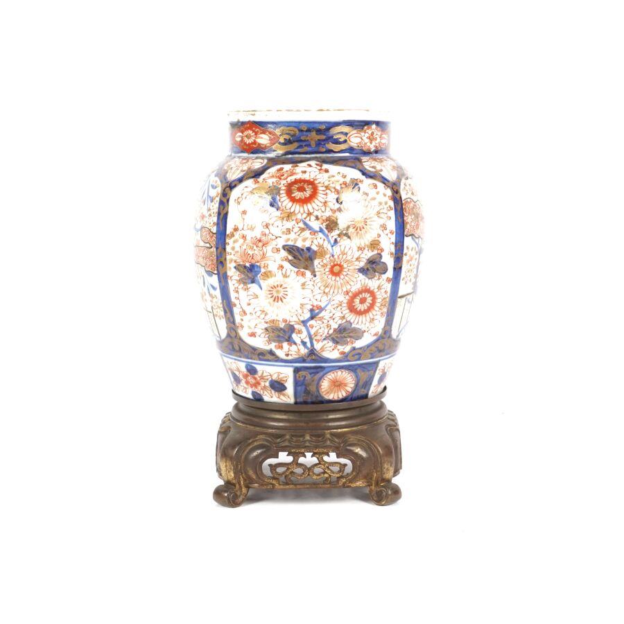 Paire de vases de forme balustre en porcelaine émaillée dite "Imari", à décor en bleu, corail et rehaut d'or, représentant des arbustes en fleurs et des compositions florales, montés sur des bases en bronze à patine brune de style européen, Japon, circa 1980, H. 27 cm (fond percé).