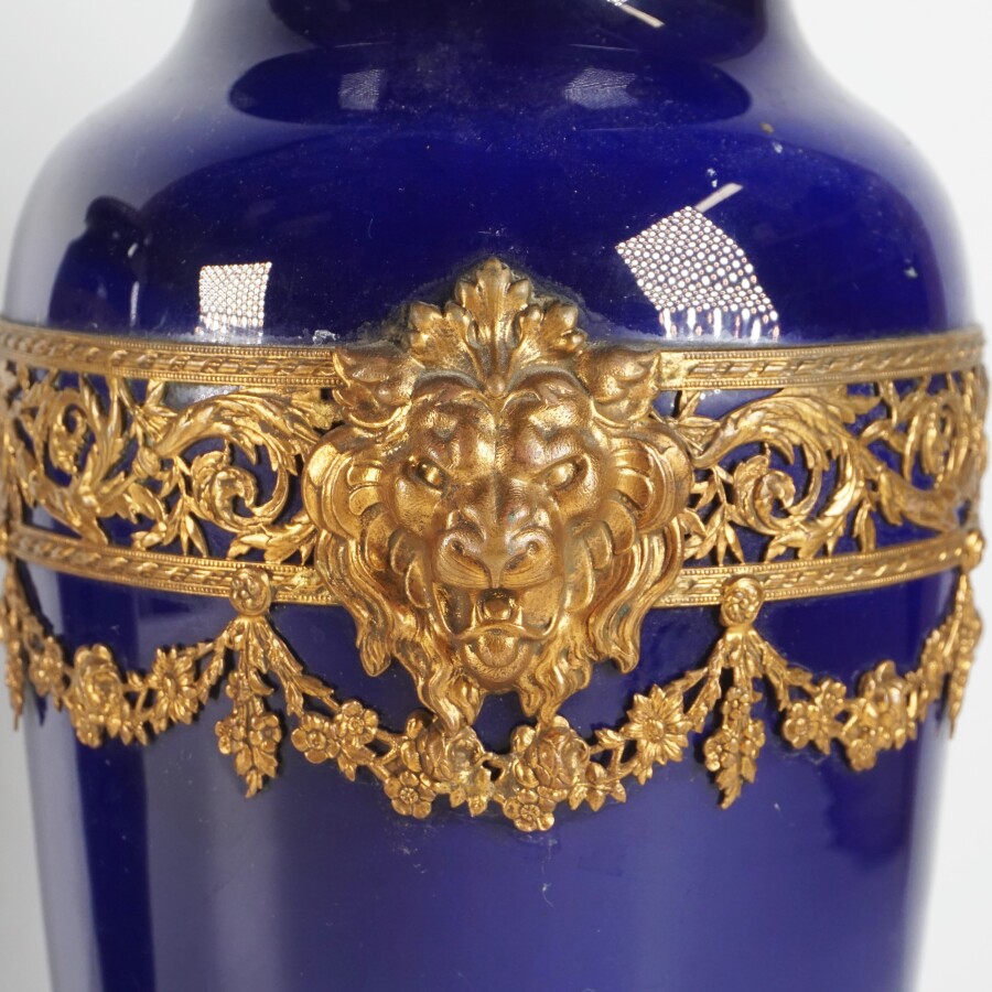 Paire de vases de forme balustre en porcelaine émaillée bleue, ornés d'une frise en métal doré à décor florale agrémentée de mufles de lion, le col à motif d'une frise perlée, H. 29 cm (quelques éclats, manques des éléments de métal).