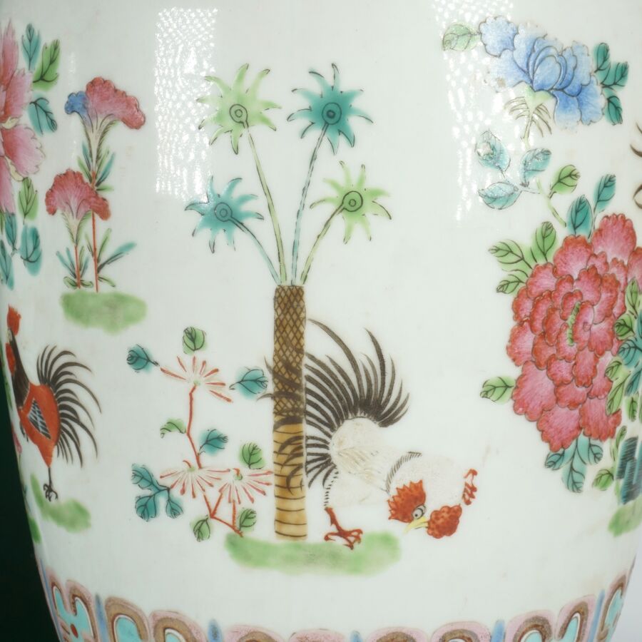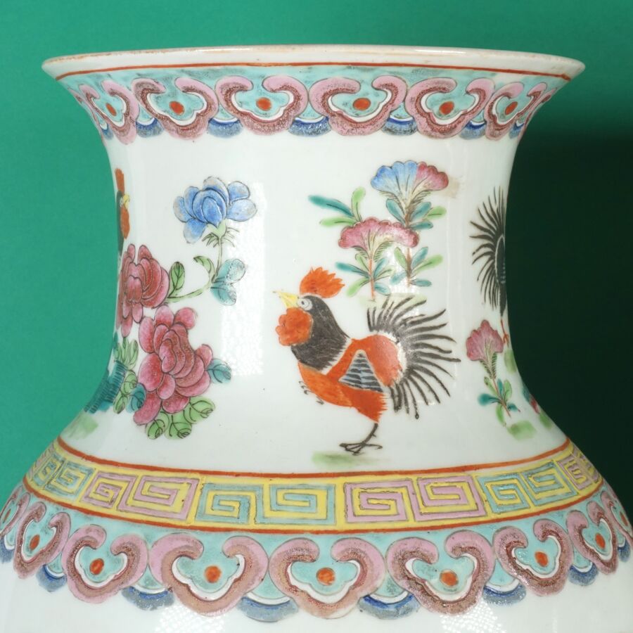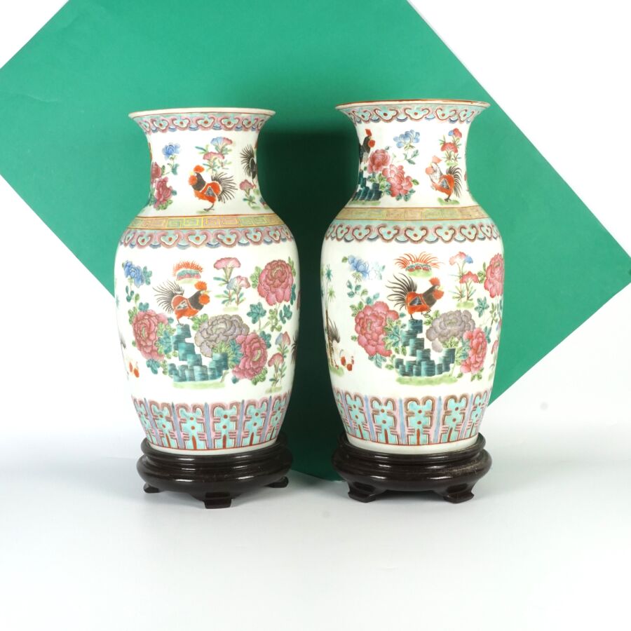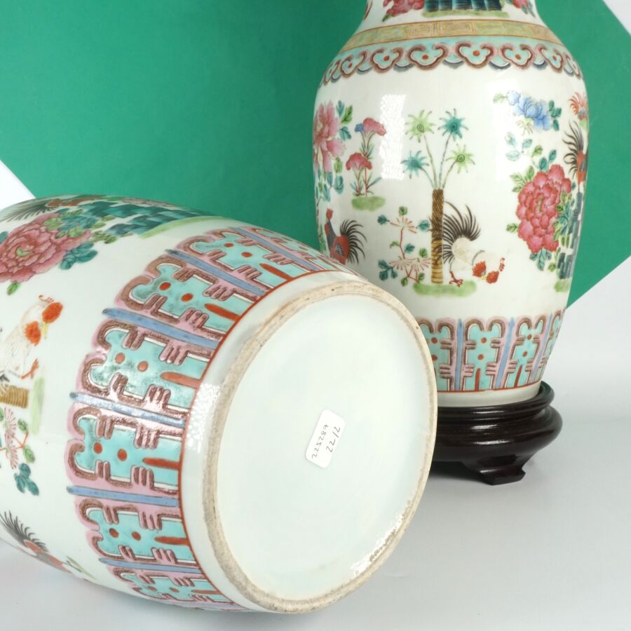 Paire de vases de forme balustre en porcelaine et émaux de style famille rose à décor de coqs parmi des fleurs de pivoine, le col, la panse et le talon ornés de motifs de ruyi, frises de grecques et pétales de lotus stylisés, Chine, Canton, circa 1900, H. 36 cm.