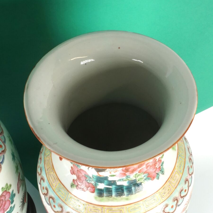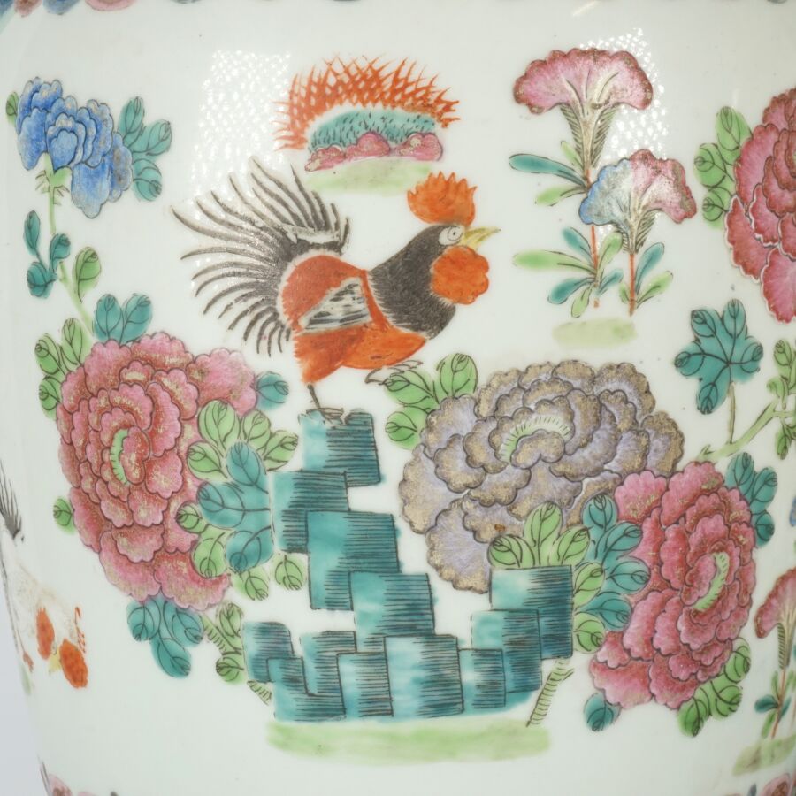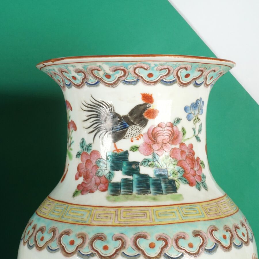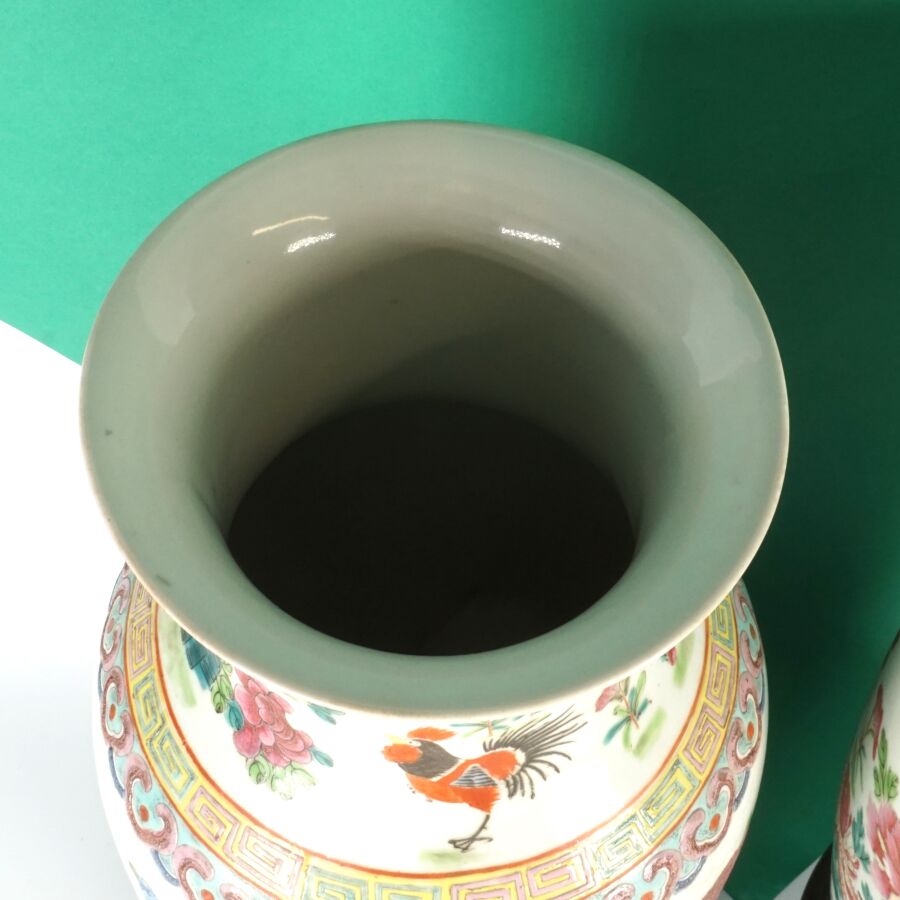 Paire de vases de forme balustre en porcelaine et émaux de style famille rose à décor de coqs parmi des fleurs de pivoine, le col, la panse et le talon ornés de motifs de ruyi, frises de grecques et pétales de lotus stylisés, Chine, Canton, circa 1900, H. 36 cm.