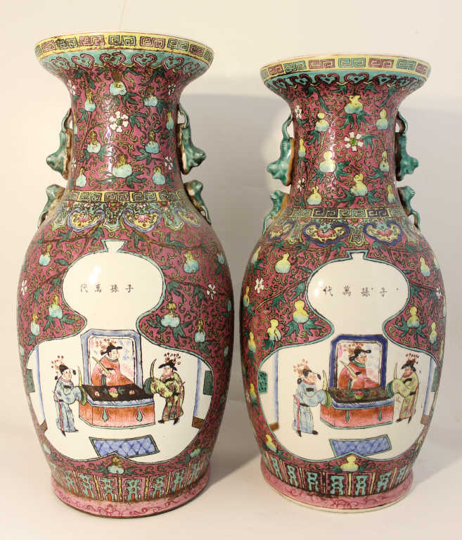 Paire de vases en porcelaine polychrome de Canton, à décor de scènes de personnages dans des médaillons, se détachant sur un fond de coloquintes et de feuillages, Chine, vers 1970, H. 48 cm