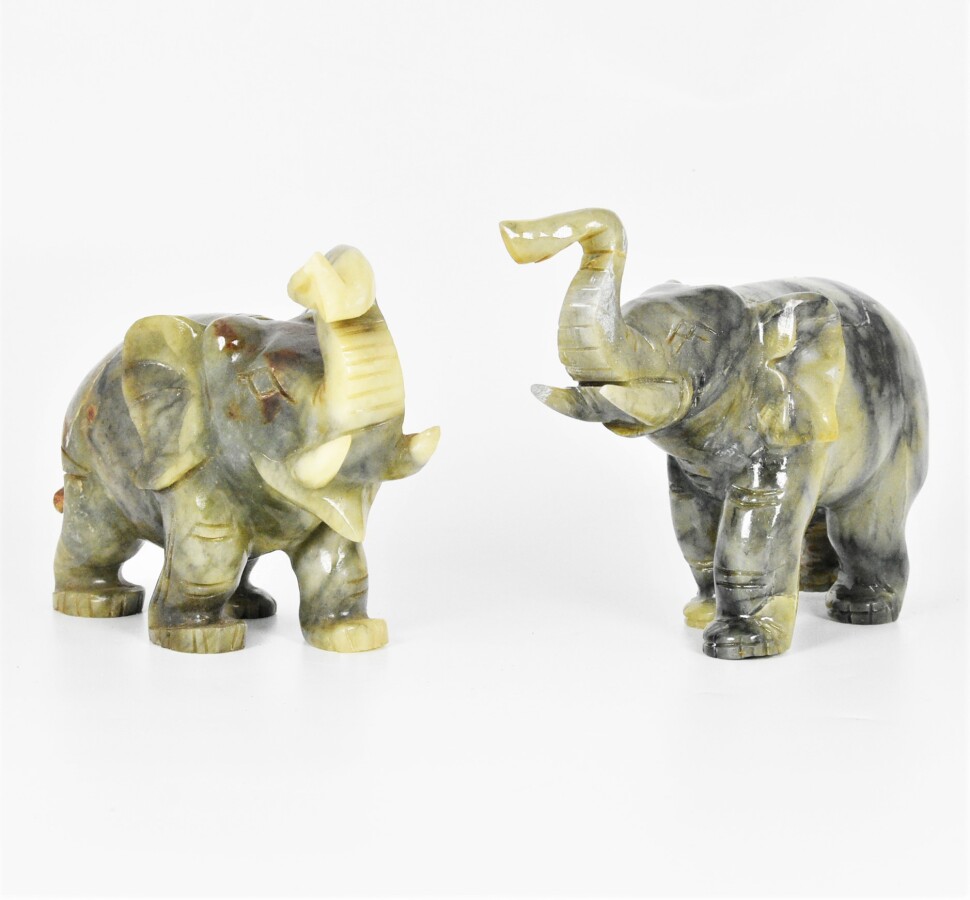 Paire d'éléphants en serpentine sculptée, Chine, 20e siècle, H. 15 cm, L. 20 cm (accidents).