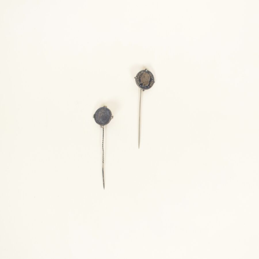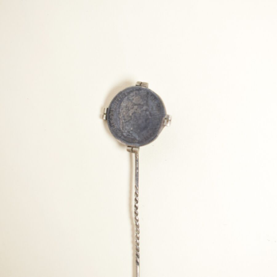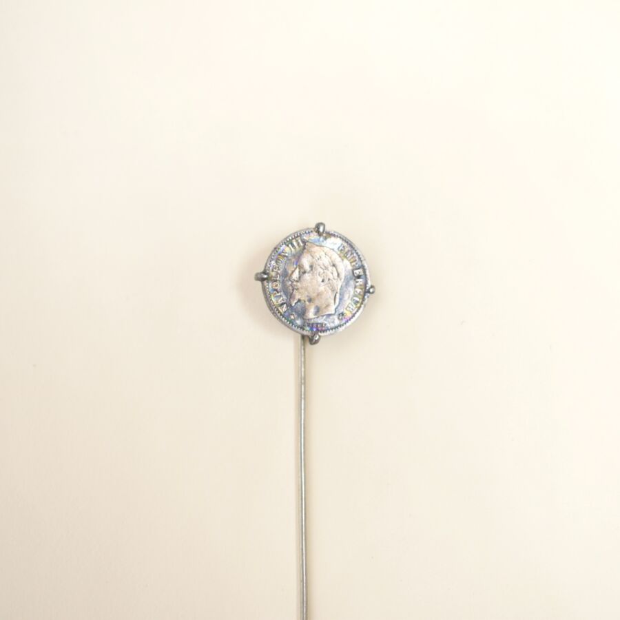 Paire d'épingles de cravate en métal argenté, serties d'une pièce en argent à l'éfigie de l'Empereur Napoléon III, travail du 19ème siècle, Long. 6 cm