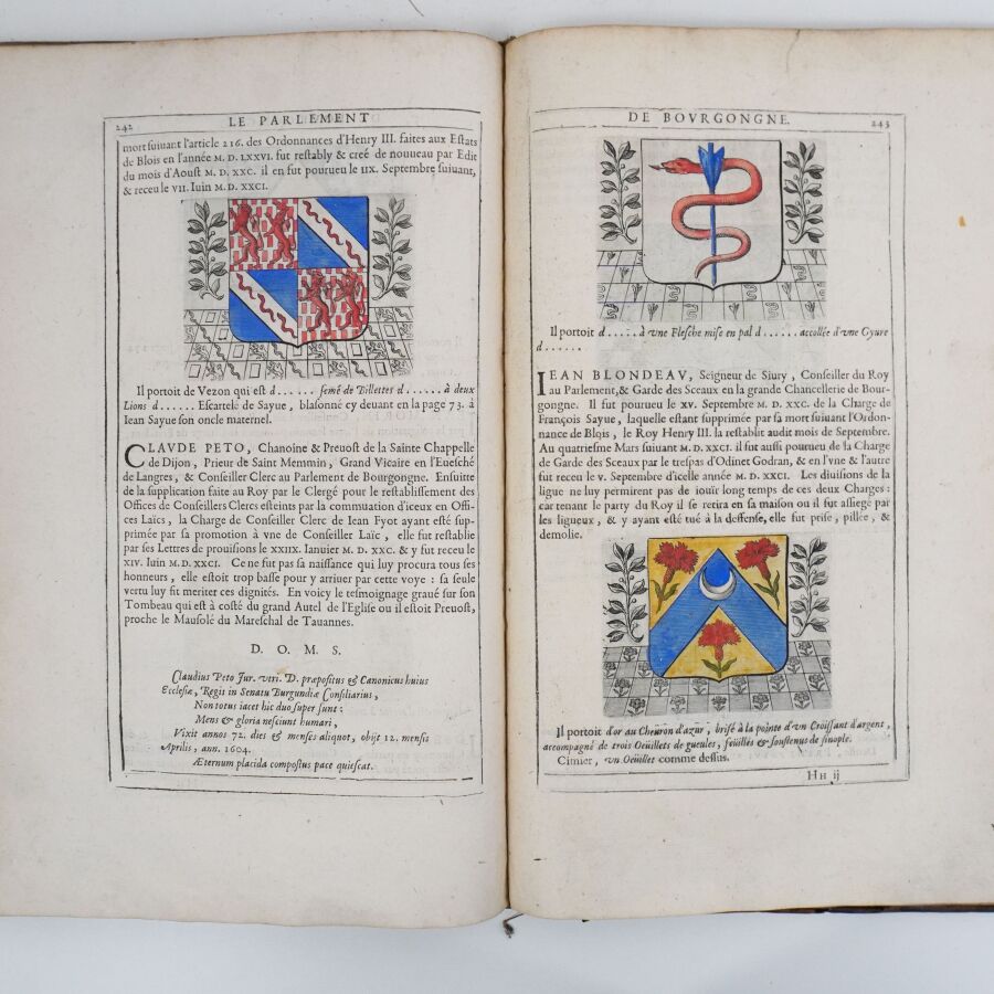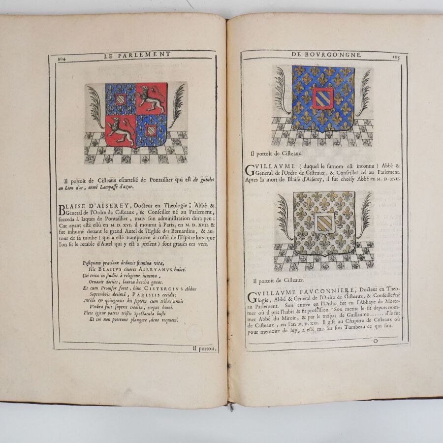 Édition originale de ce recueil rédigé par Pierre Palliot, libraire et imprimeur du Roi, sur les registres du parlement et de la chambre des compte de Dijon. Il s'arrête vers 1636.