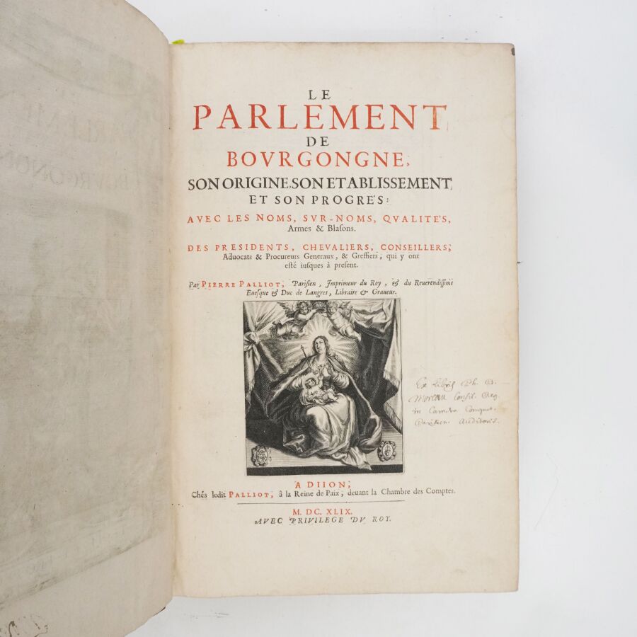 PALLIOT (Pierre). Le Parlement de Bourgongne[sic], son origine, son établissement et son progrès avec les noms, sur-noms, qualités, armes & blasons des présidents, chevaliers, conseillers, advocats & procureurs généraux, & greffiers, qui y ont esté jusques à présent. Dijon, Palliot, 1649. In-folio, basane mouchetée, dos à nerfs richement orné (reliure de l'époque).
