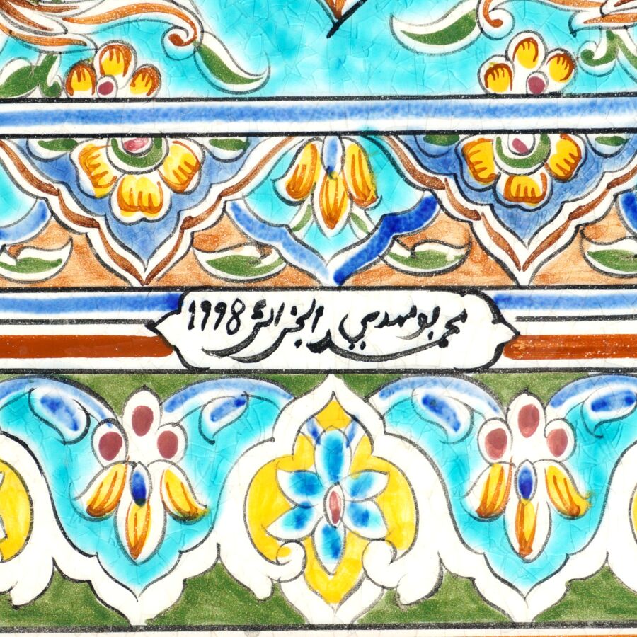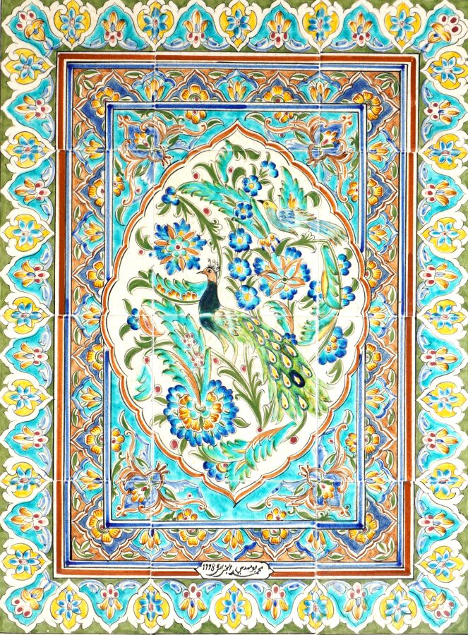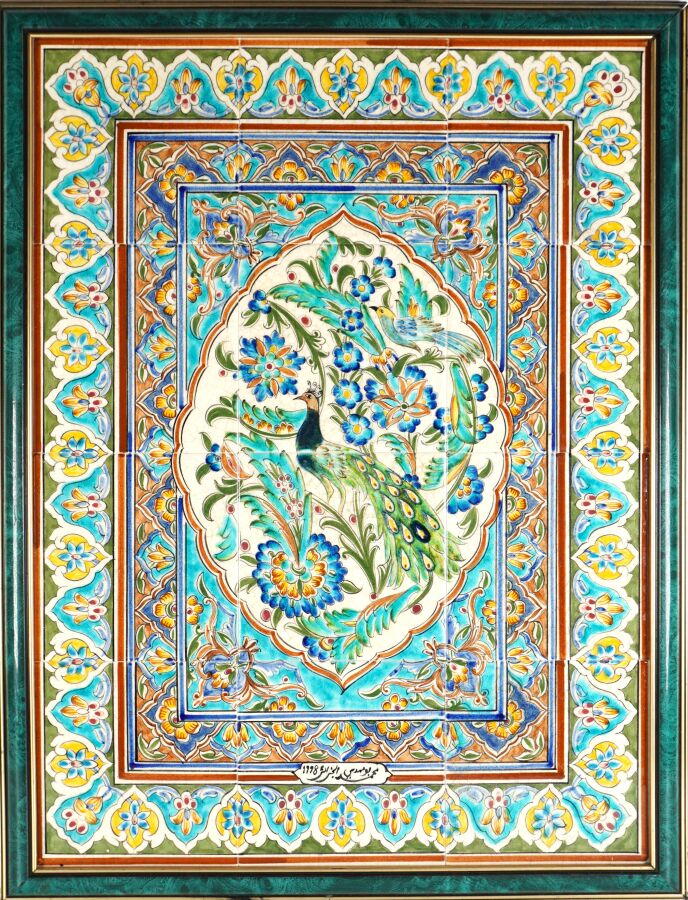 Panneau composé de carreaux de faïence émaillée polychrome figurant un paon, dans un entourage floral et feuillagé, daté 1998 et porte une inscription en bas au centre, dans le goût de l'Orient, 59.8 x 44 cm.