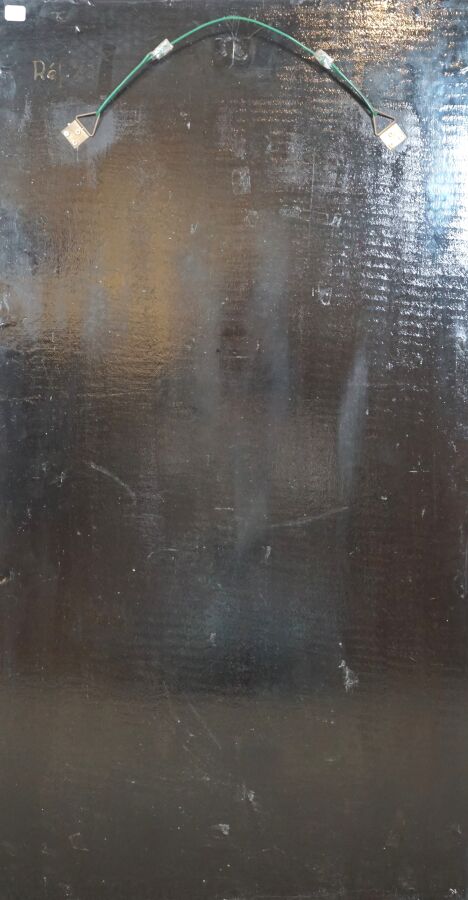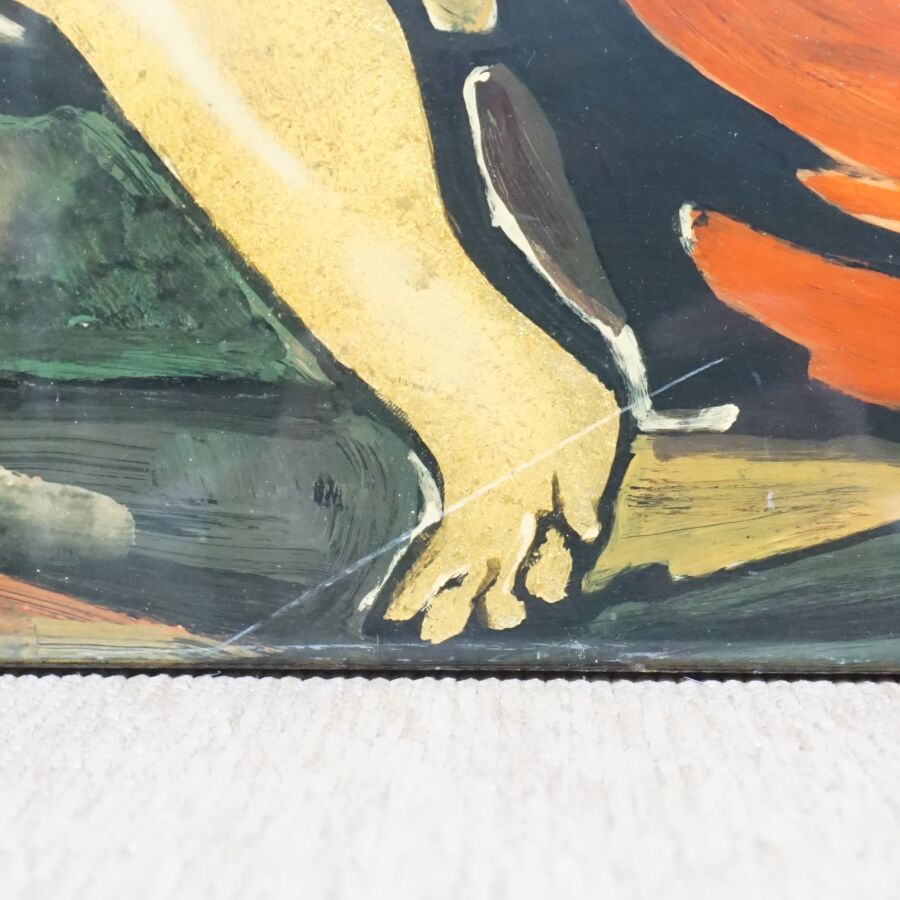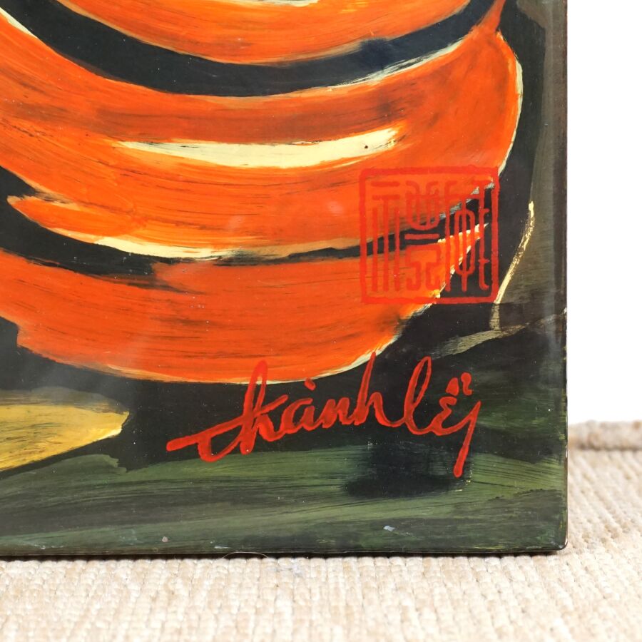 Panneau de laque figurant deux femmes tenant des jarres, porte une signature difficilement lisible en bas à droite, 103.5 x 55 cm.
