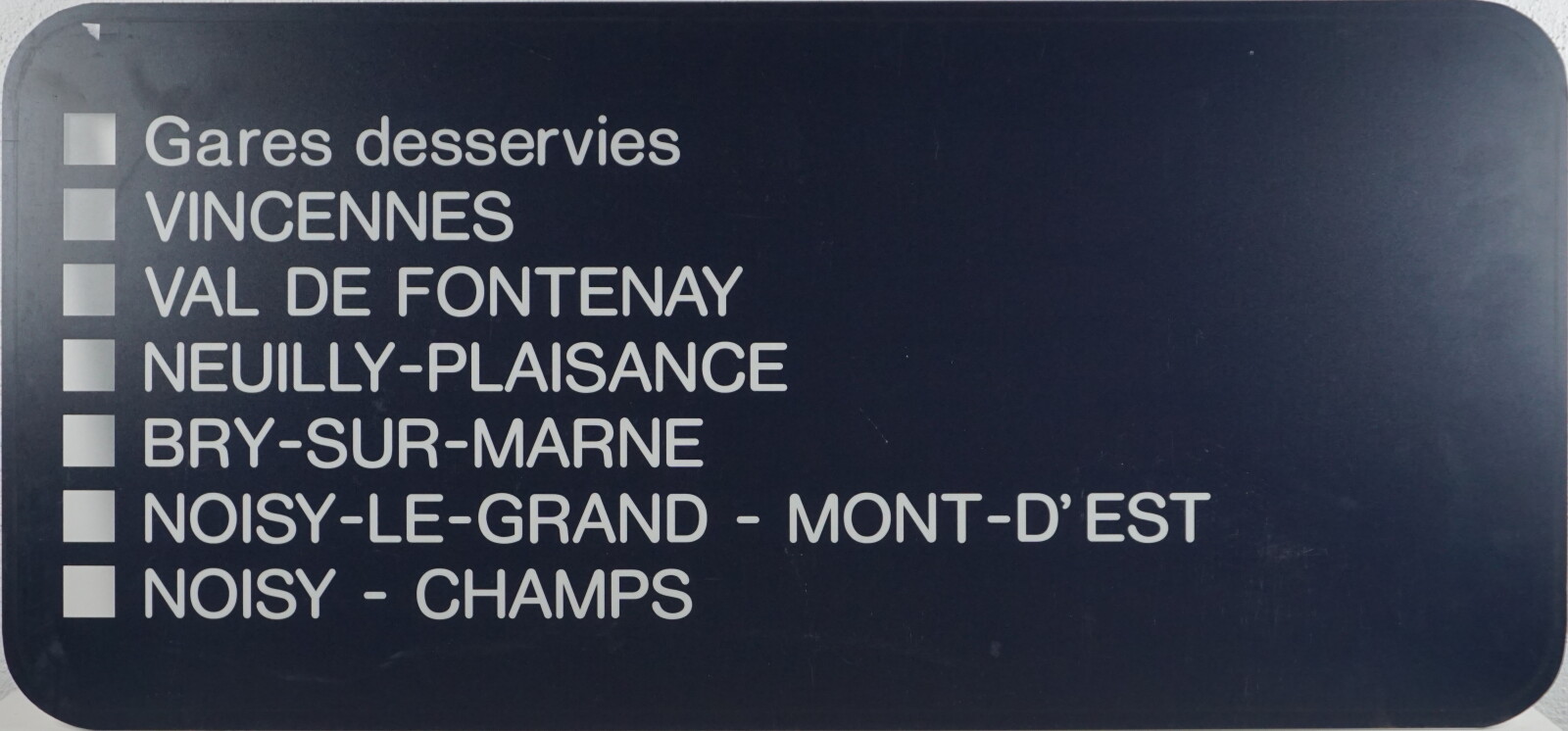 Panneau ferroviaire, matière plastique, indiquant les gares desservies, 45.5 x 97.5 cm (petites rayures).