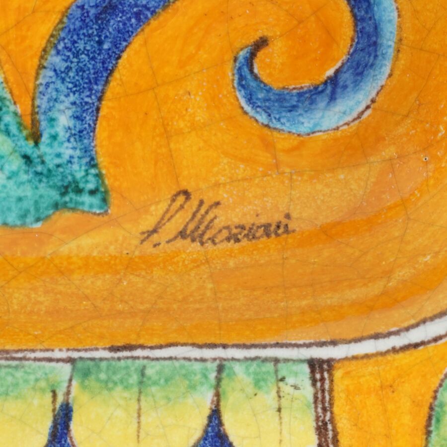 Paolo MARIONI (XX-XXIe), Plat en faïence émaillée polychrome à décor en plein d'un oiseau stylisé, signé dans le décor, marqué au dos, 35 x 35 cm.