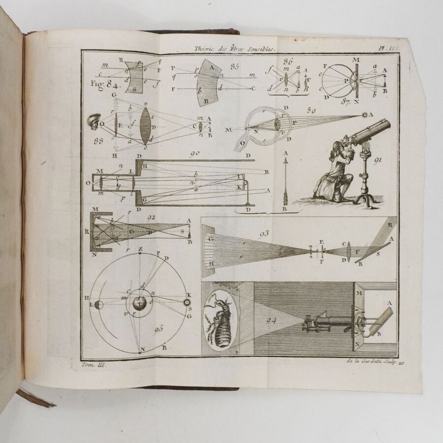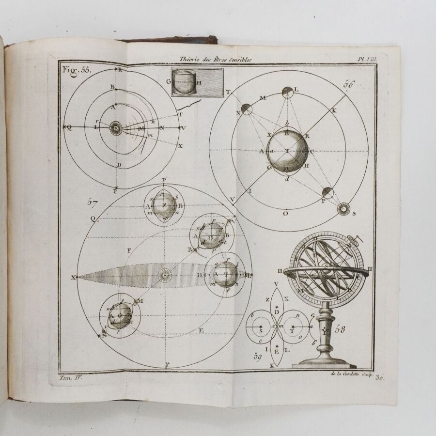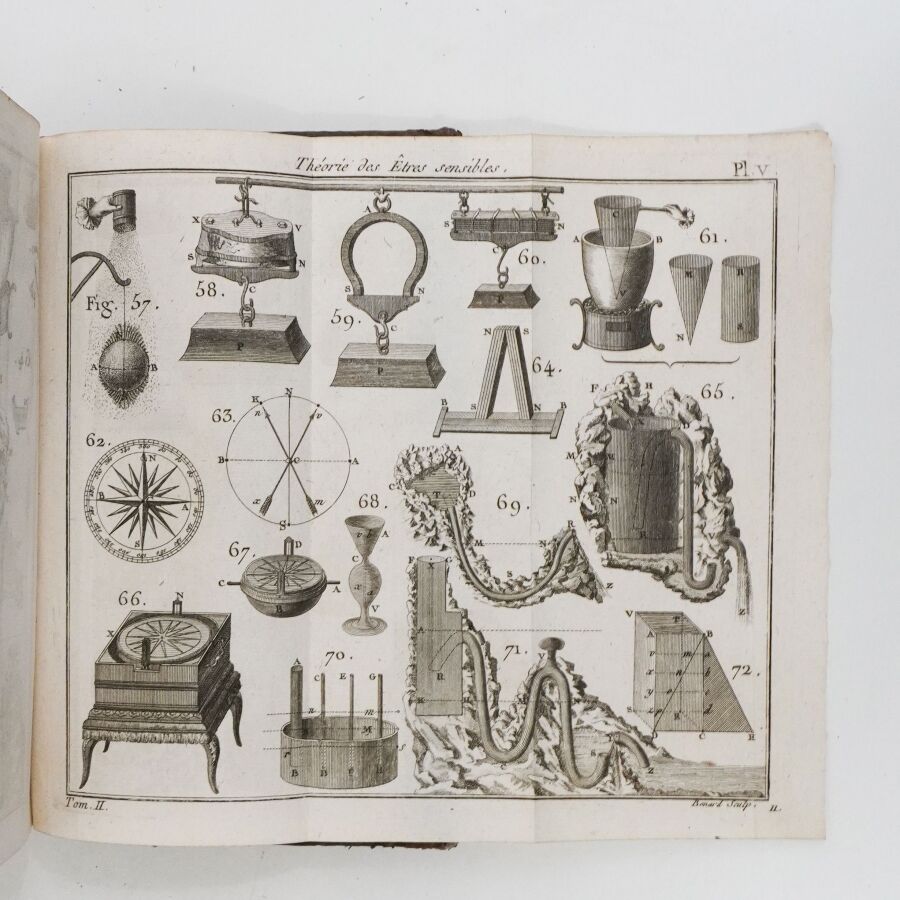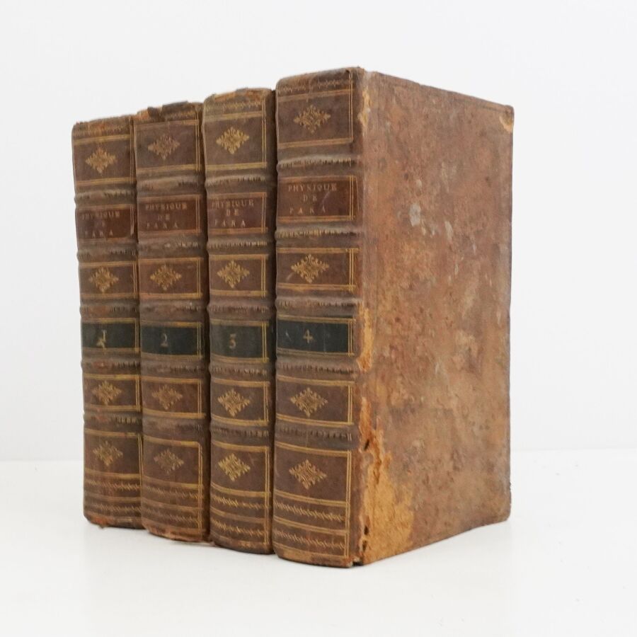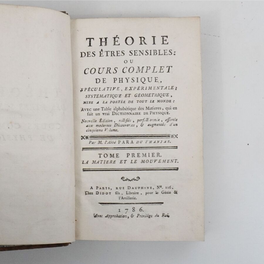 PARA DU PHANJAS (François). Théorie des êtres sensibles, ou Cours complet de physique, spéculative, expérimentale, systématique et géométrique, mise à portée de tout le monde, avec une table alphabétique des matières, qui en fait un vrai Dictionnaire de physique. Paris, Didot fils, 1786. 4 vol. in-8, veau marbré, dos à nerfs orné, pièces de titre et de tomaison (reliure de l'époque). 31 planches hors texte dépliantes. Le titre annonce que cette nouvelle édition rectifiée et augmentée comprend un cinquième volume ; il est ici absent.