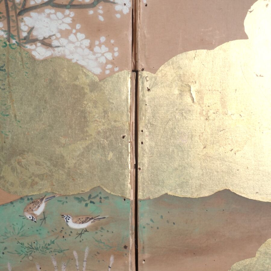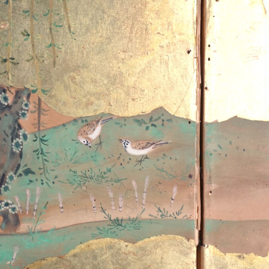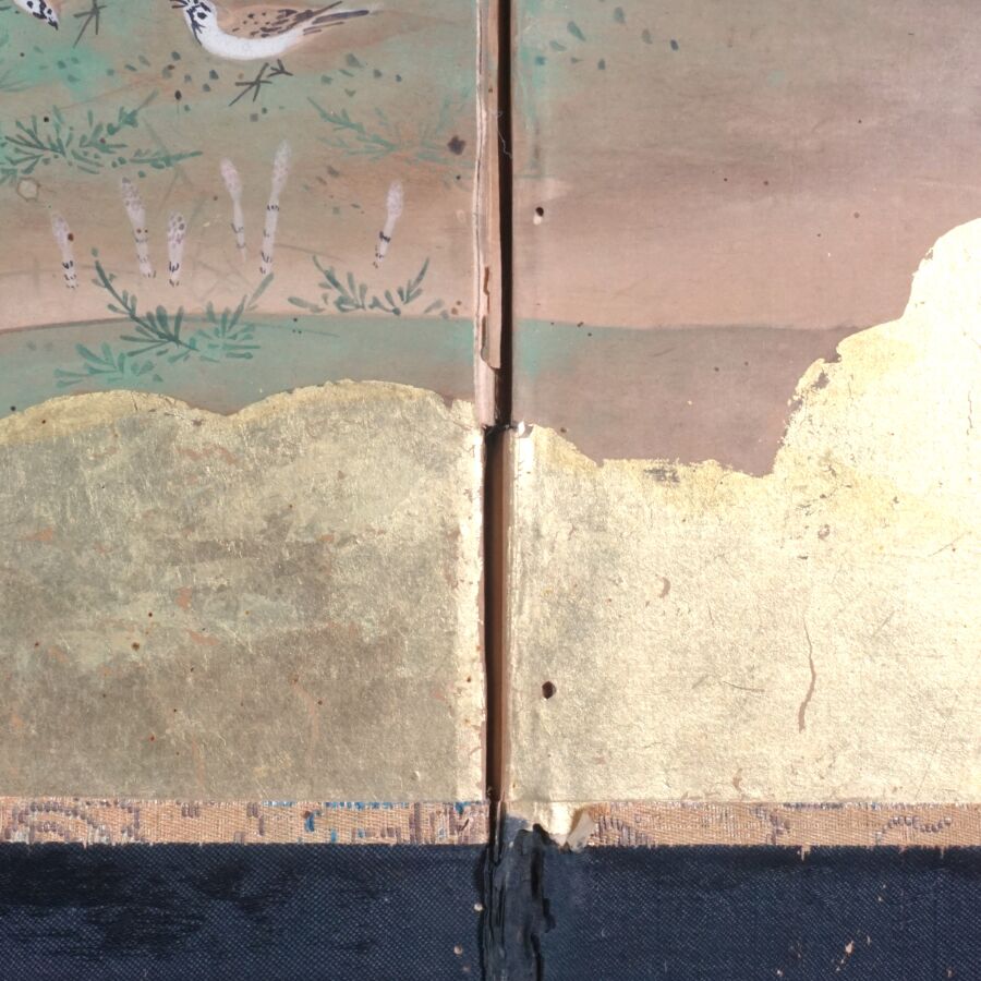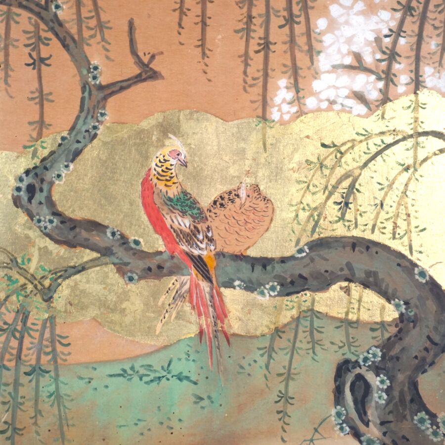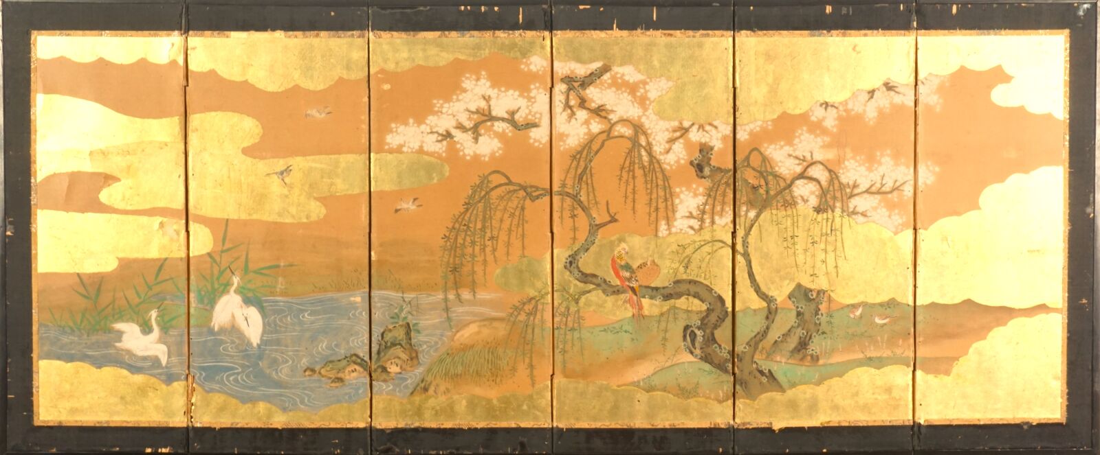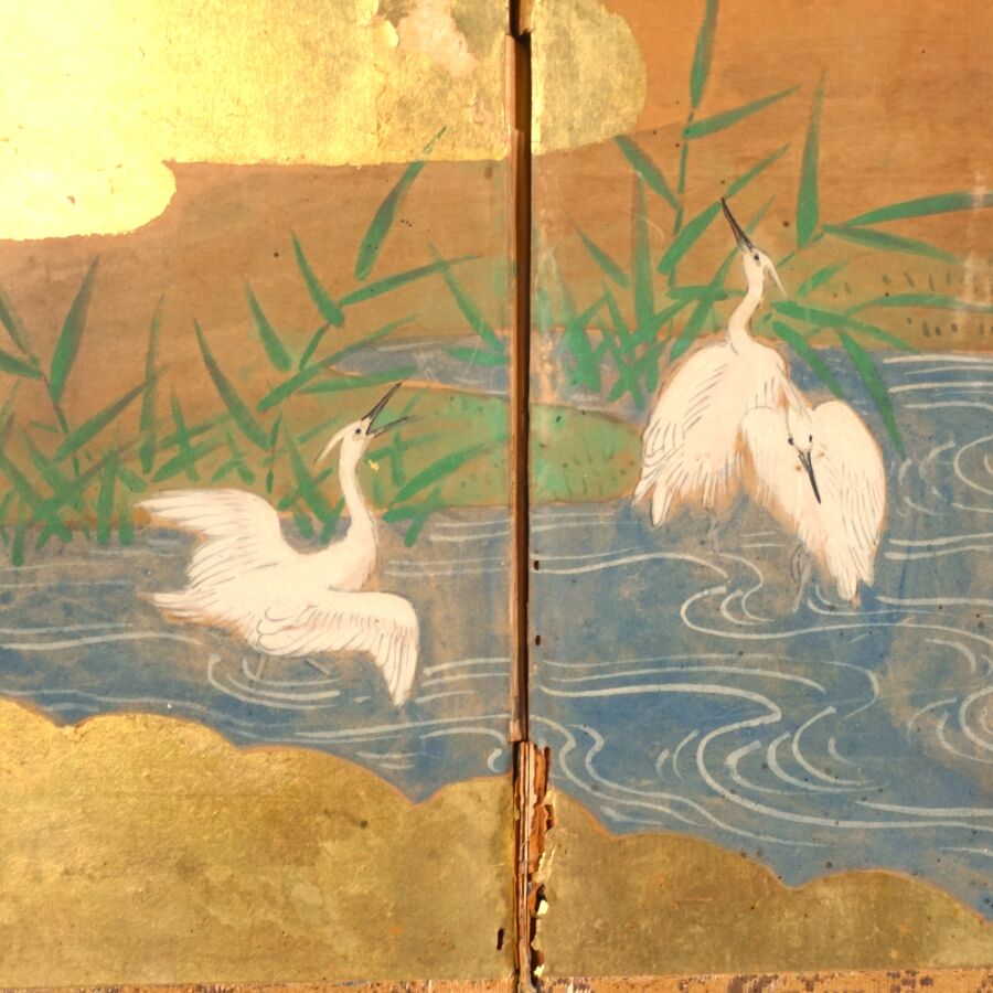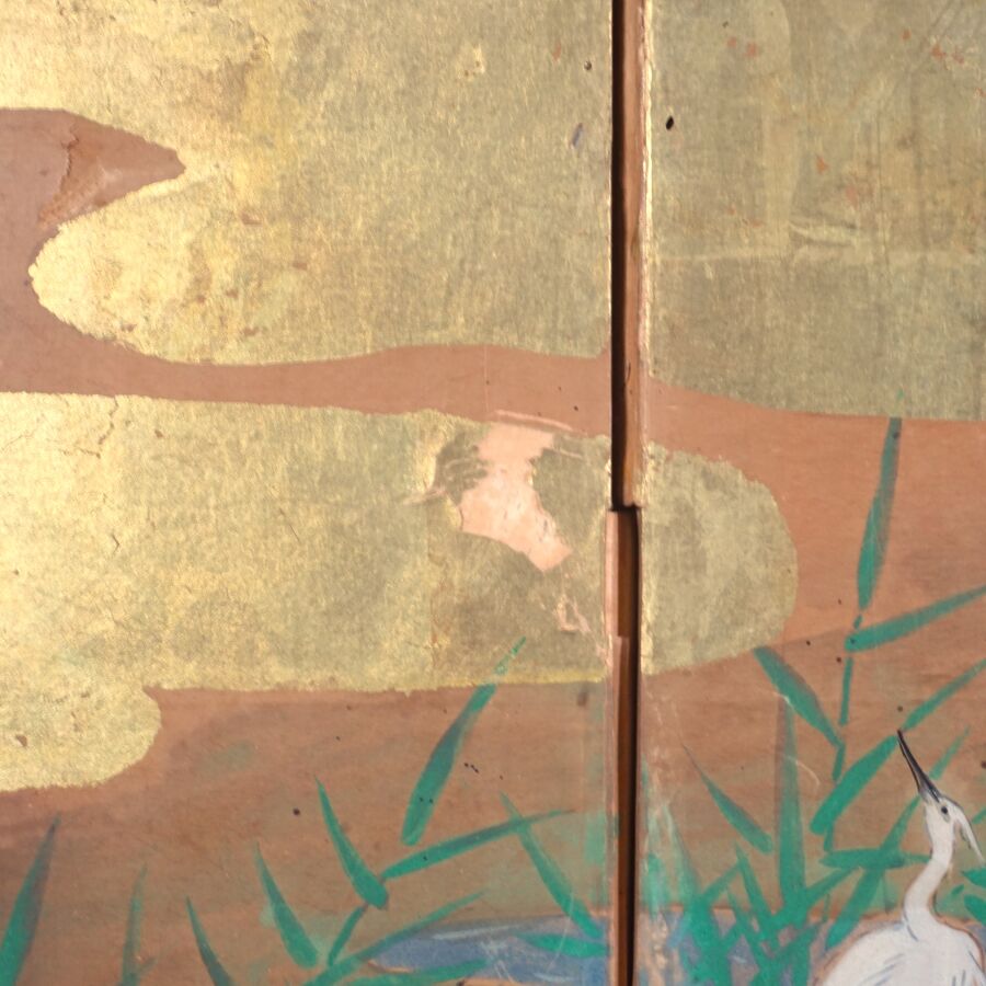 Paravent à six feuilles à l'encre, couleur et rehauts d'or sur papier à décor de grues émergeant des flots parmi des branches de bambous, faisans perchés sur une branche de saule pleureur et oiseaux volant, Japon, période Meiji, Dim. 41,5 x 102 cm (déchirures et usures).