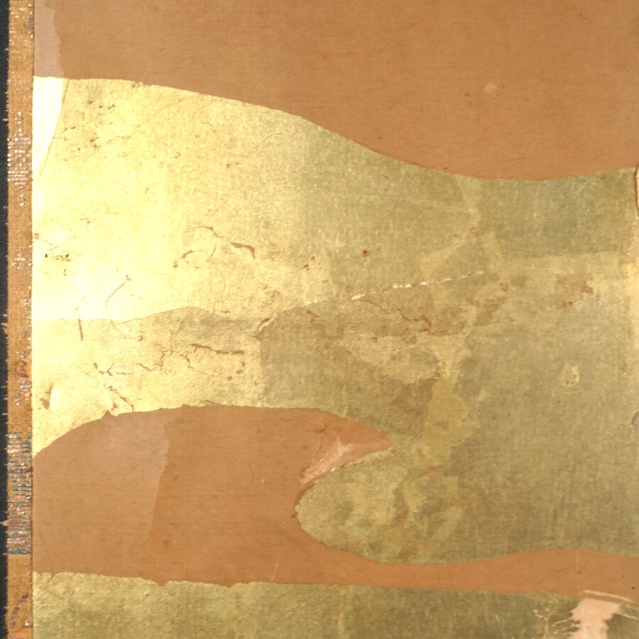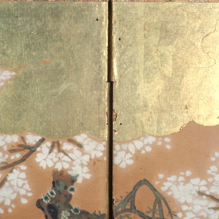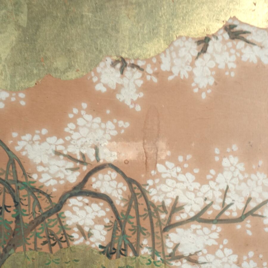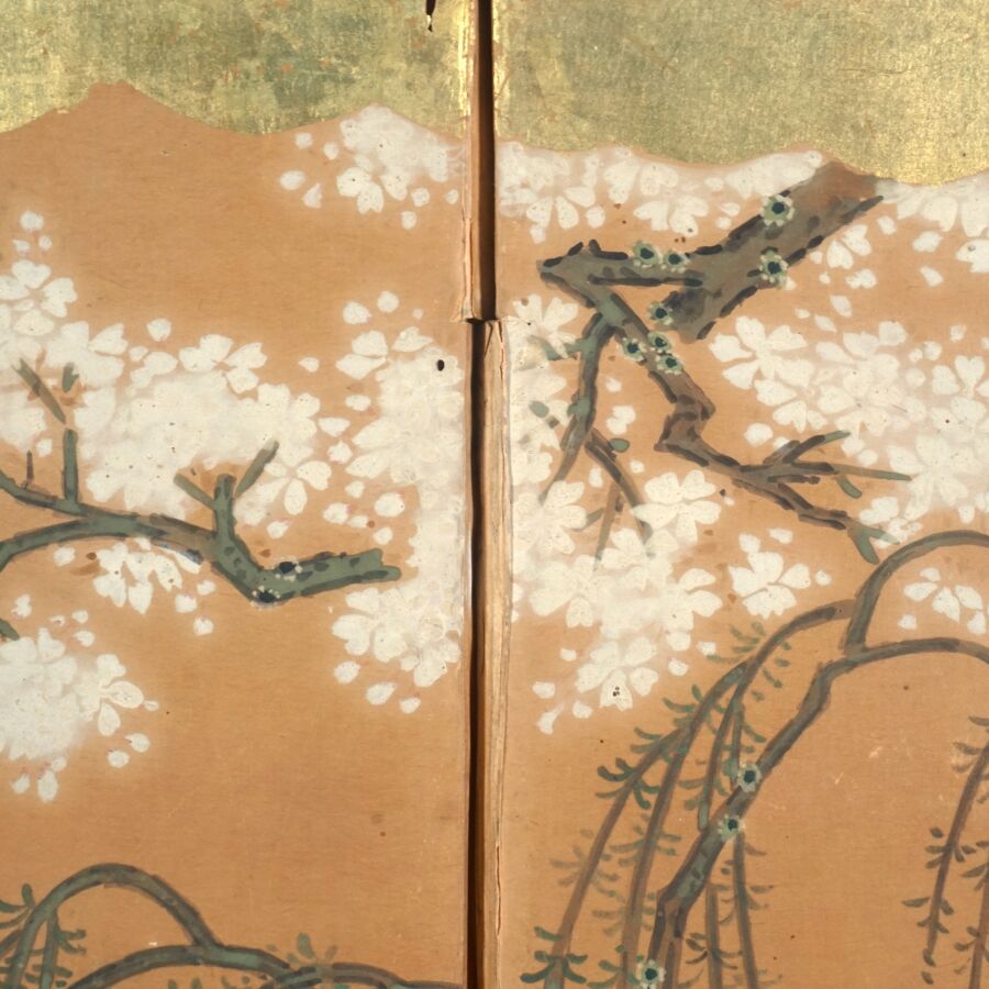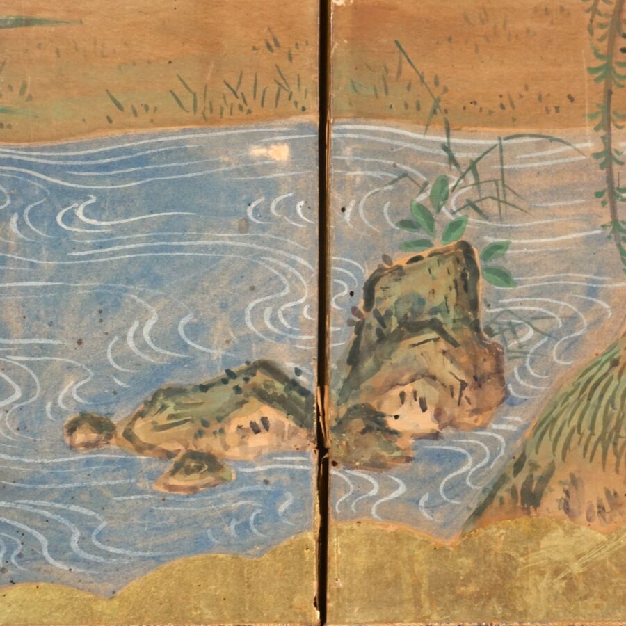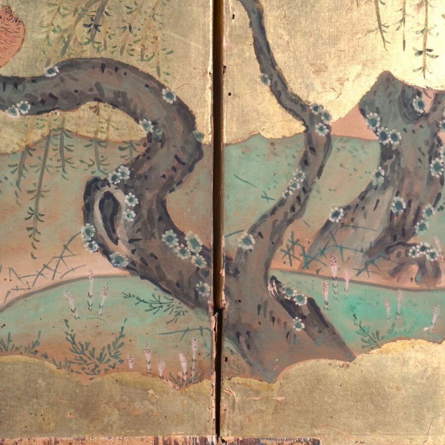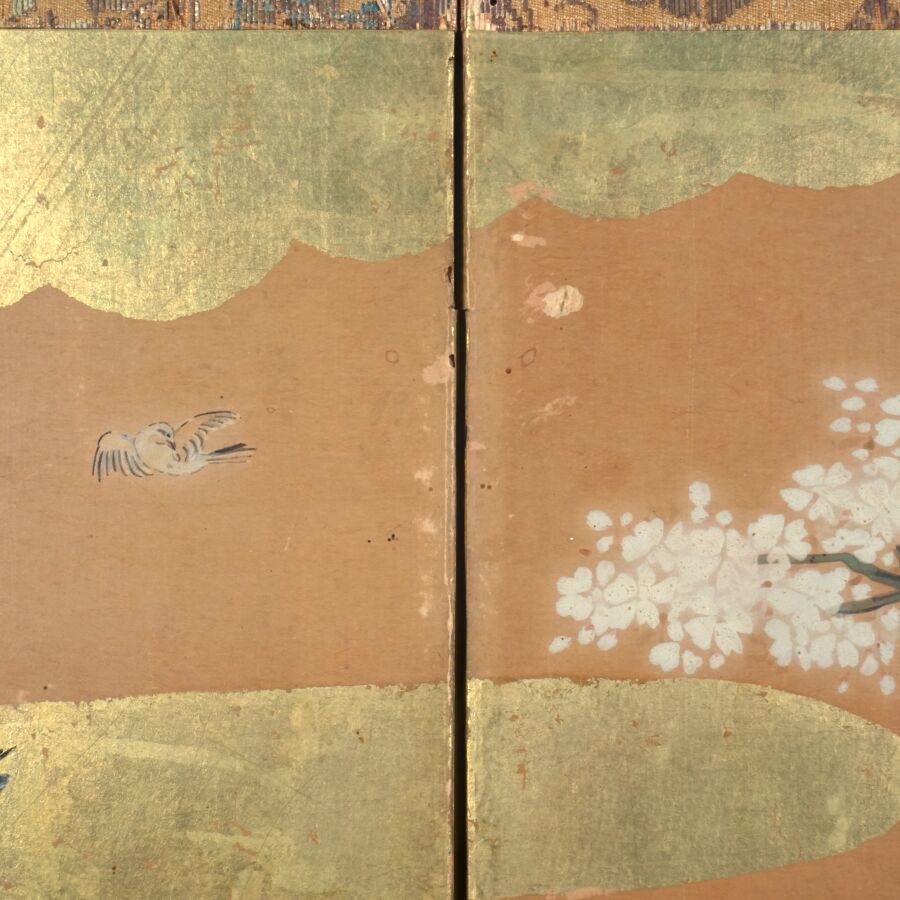 Paravent à six feuilles à l'encre, couleur et rehauts d'or sur papier à décor de grues émergeant des flots parmi des branches de bambous, faisans perchés sur une branche de saule pleureur et oiseaux volant, Japon, période Meiji, Dim. 41,5 x 102 cm (déchirures et usures).