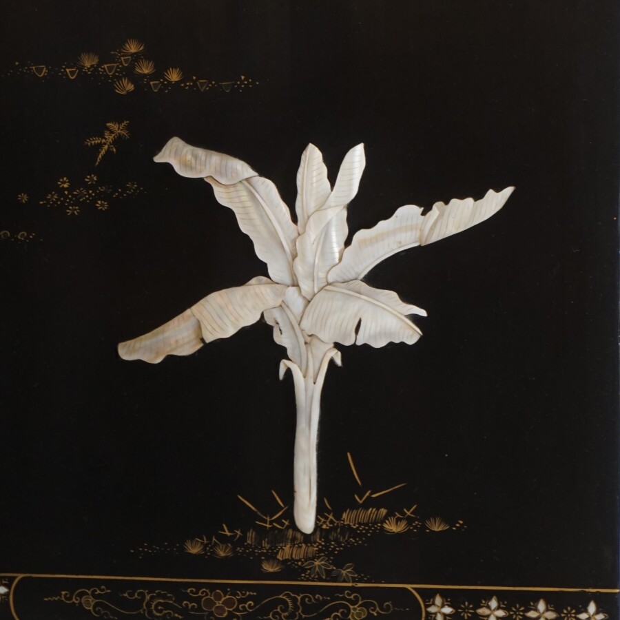 Paravent à six feuilles, bois laqué noir, à décor rehaussé à l'or sur un côté d'oiseaux branchés et de l'autre, de scènes animées de personnages en léger-relief et orné de nacre, Chine, 20ème siècle, H. 183 cm x 40 cm (chaque feuille) (rayures).