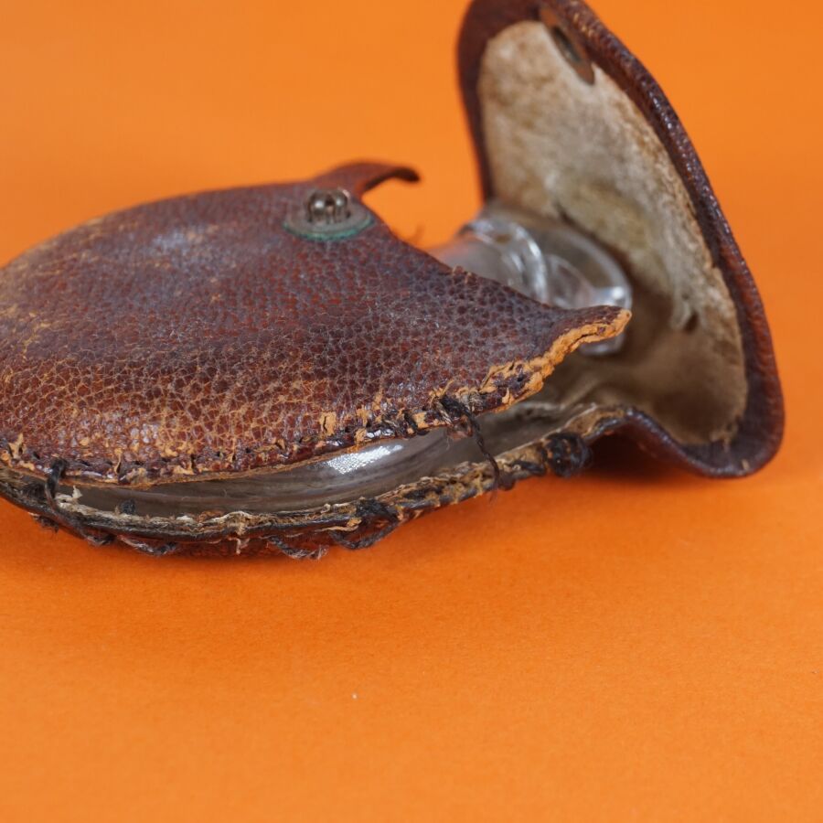 On joint "Violette d'Orsay", flacon de poche en verre incolore, forme ronde, avec son bouchon, étiquette dorée, dans son étui en cuir marron, H. Flacon : 6.1 cm (vide, étui en l'état).