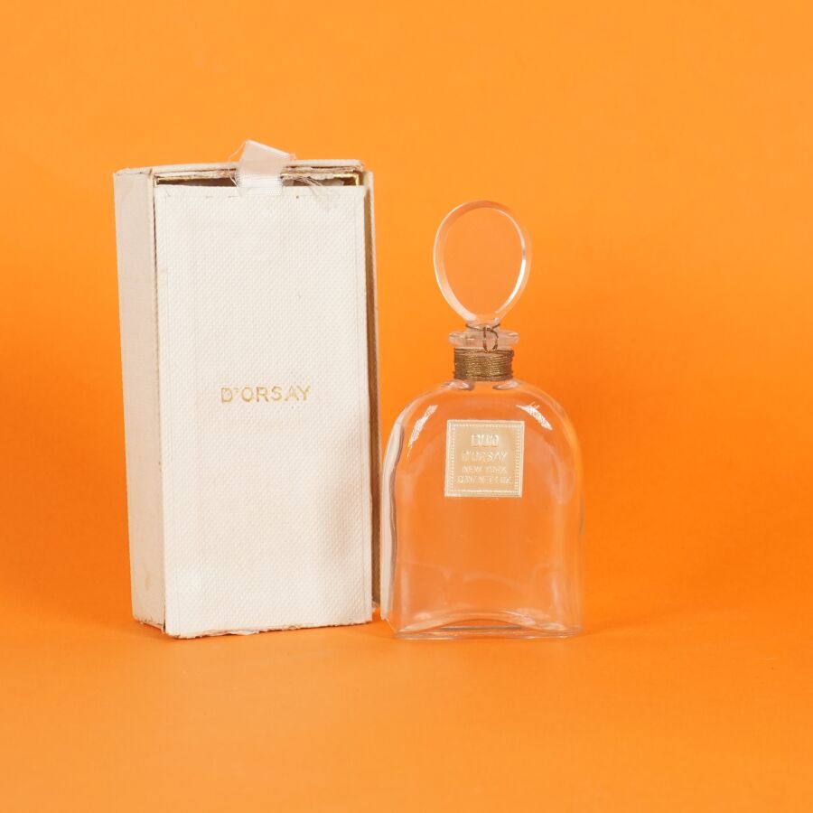 PARFUMS D'ORSAY : "Duo", flacon en verre incolore, étiquette argentée sur une face "Duo d'Orsay, New York", bouchon pastille scellé, présenté dans sa boîte (en l'état), H. Flacon : 10 cm (vide, éclat).