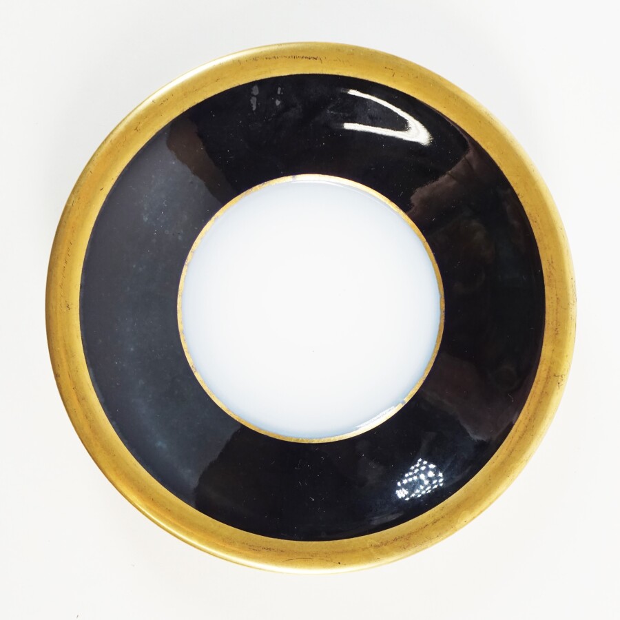 PARIS : Ensemble en porcelaine émaillée et rehauts d'or comprenant une tasse et sa soucoupe ; une tasse et un vase de forme Médicis, divers décors, H. 13 cm environ (petits éclats, fêle et une restauration).