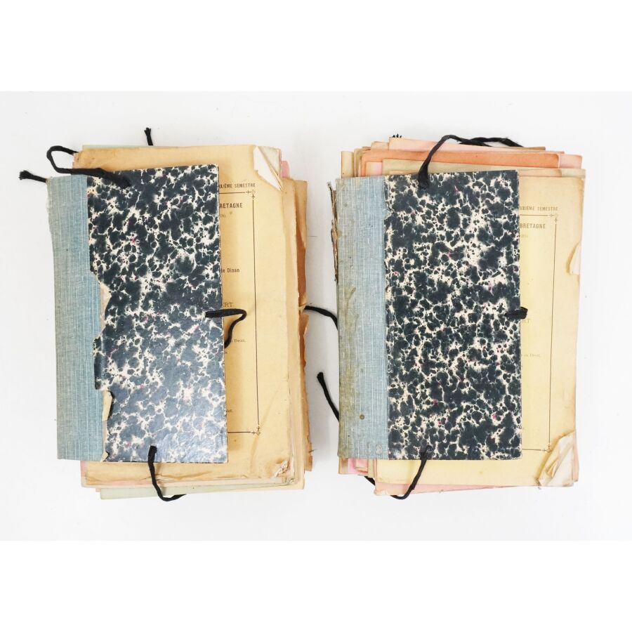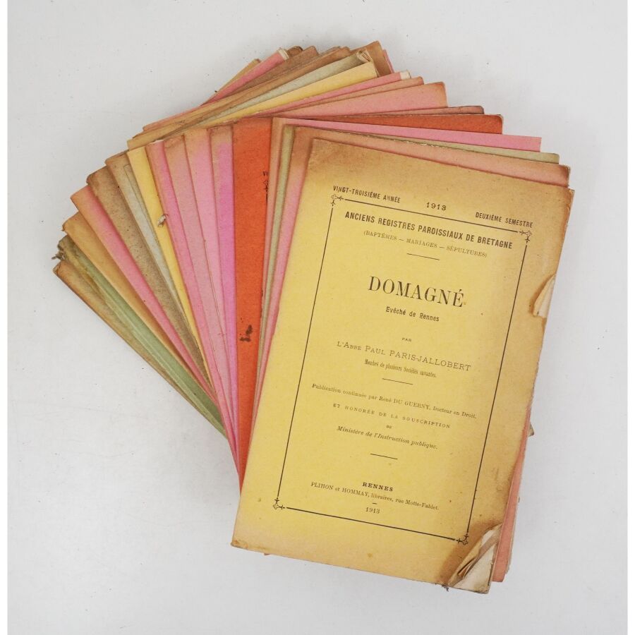 PARIS-JALLOBERT (Abbé Paul). Anciens registres paroissiaux de Bretagne : Aucaleuc, Baillé, Bonnemain, La Chappelle-Erbrée, Brusvily, Brecé, Chateaubourg, Chateaugiron, Le Chatellier, Chevaigné, Combourtillé, Dinan, Domagné, Domalain, Dourdain, Eancé, Epiniac, Fercé, Gomené, La Gouesnière, Guipry, Illifaut, Lancieux, Lillemer, Le Loroux, Marpiré, Mellé, Moigné, Montault, Moussé, Izé, Moutiers, Noyal-sur-Vilaine, Piré, Plesder, Le Plessis-Balisson, Pleugueneuc, Ploubalay, Plouer, Plumaudan, Princé. Rennes, Plihon et Hommay, 1907-1914. Ensemble de 48 plaquettes brochées réunies sous deux portefeuilles cartonnage demi-toile à lacets.
