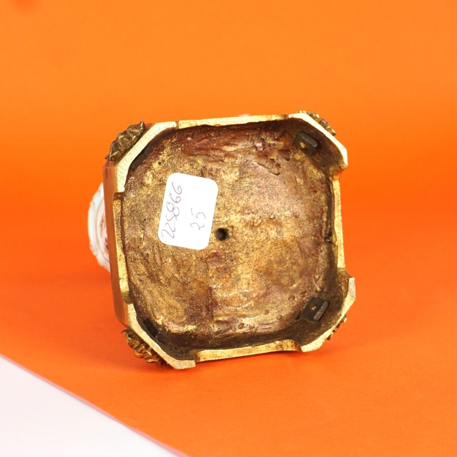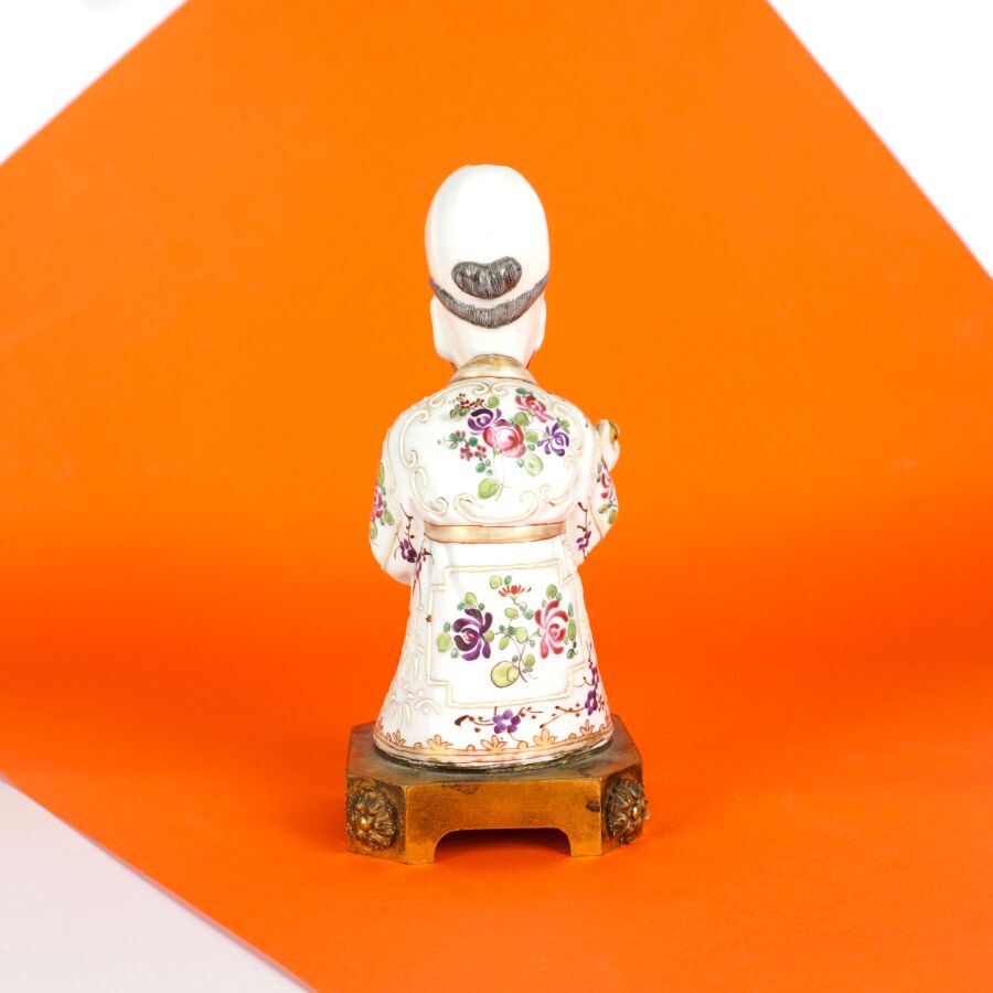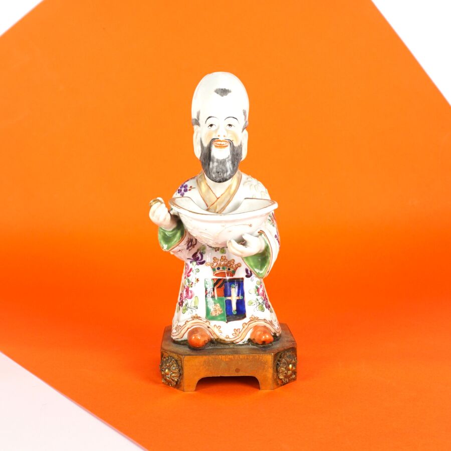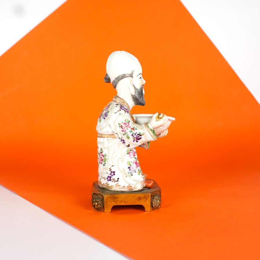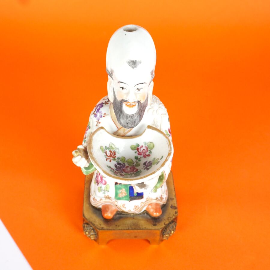 PARIS : Petit magot en porcelaine émaillée polychrome et rehauts d'or, à motif d'un personnage tenant un plat à barbe, présenté sur un socle en bronze doré, 19ème siècle, H. Totale : 16.5 cm.