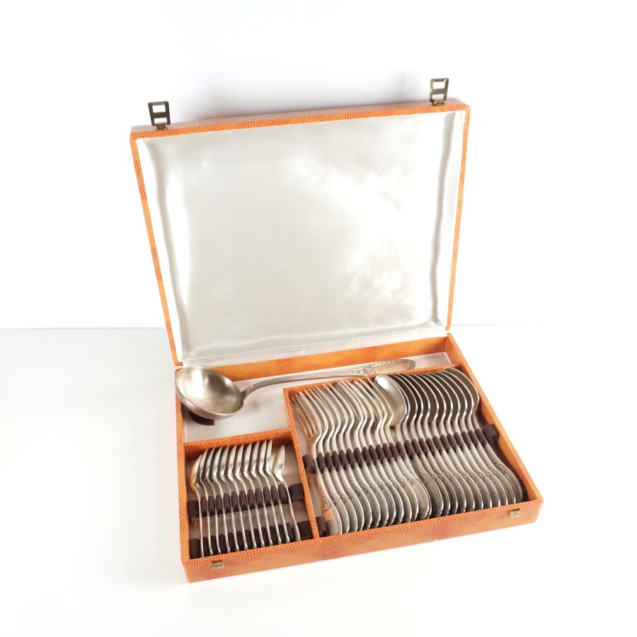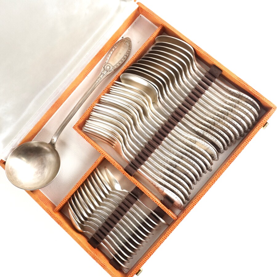 Partie de ménagère, métal argenté, à décor de frise rubanée et coquille éclatée, comprenant : 12 couverts, 12 petites cuillères et 1 louche, présentée dans un coffret.