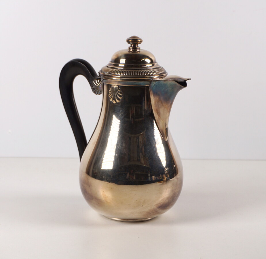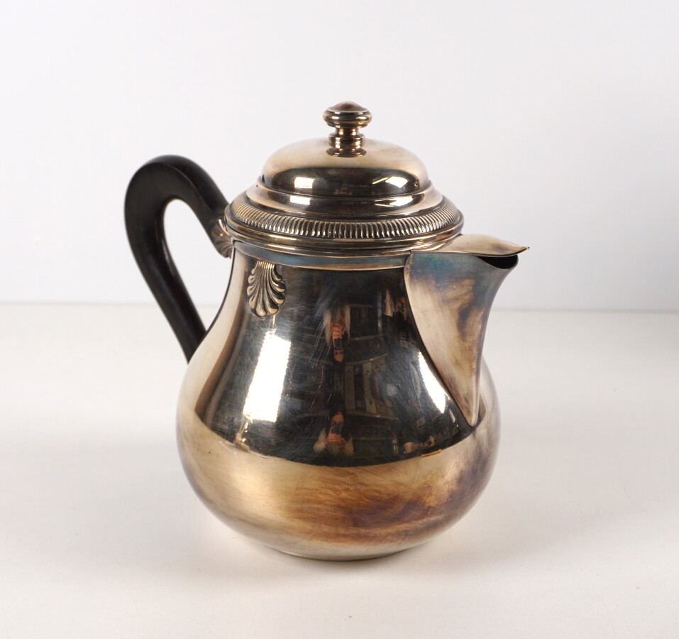 Partie de service à thé - café en métal argenté à décor de coquilles, les anses en bois noirci comprenant une théière, une cafetière et un pot à lait, H. Cafetière : 22 cm. H. Théière : 18 cm et H. Pot à lait : 10 cm.