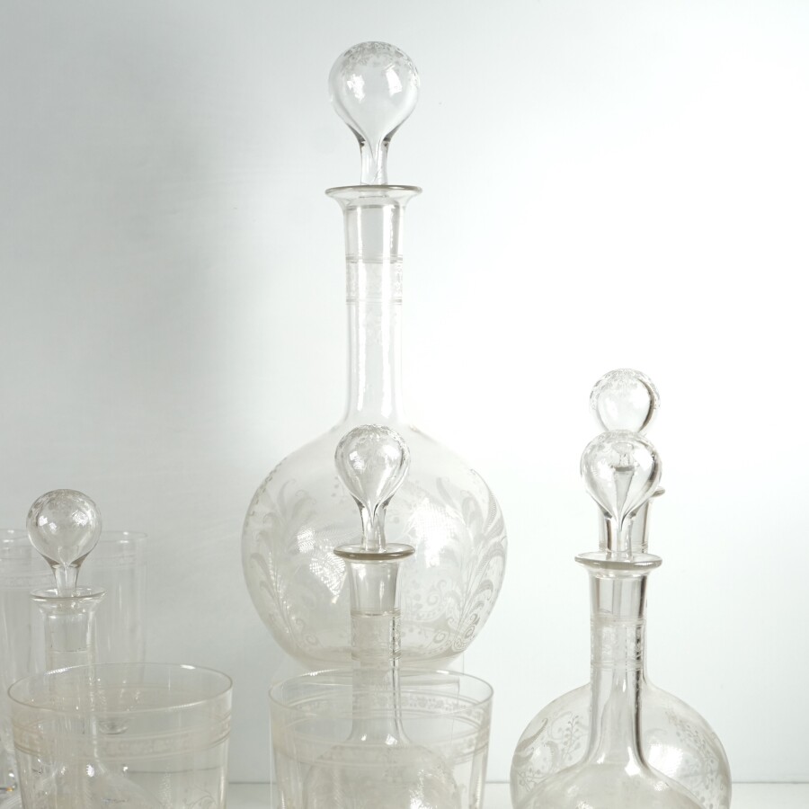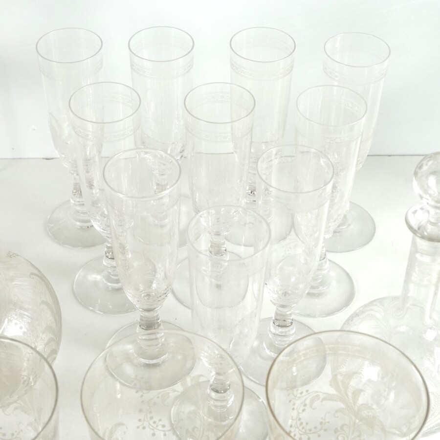 Partie de service de verres en cristal comprenant : 9 verres à eau, 9 verres à vin rouge, 7 verres à porto, 7 verres à liqueur et 10 flûtes à champagne. On y joint 4 paires de carafes : 2 grandes carafes (une sans bouchon), 2 moyennes carafes, 4 petites carafes, H. grande carafe avec bouchon 33 cm (jaunis).