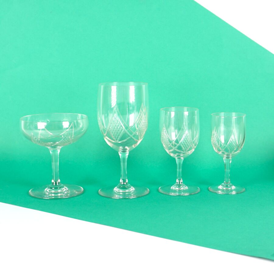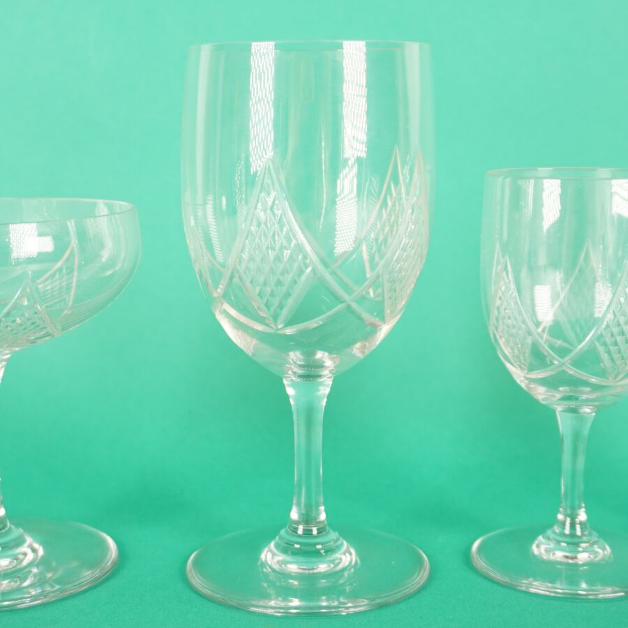 Partie de service de verres en cristal taillé à décor de pointes de diamant comprenant 5 verres à eau, 8 verres à vin, 6 verres à porto, 11 coupes à champagne, H. Verre à eau : 15 cm (rayures).