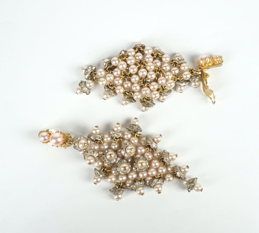 Parure de fantaisie comprenant une paire de boucles d'oreilles, H. 10 cm, et un collier plastron, l'ensemble agrémenté de perles rosées et de strass, L. 38 cm.