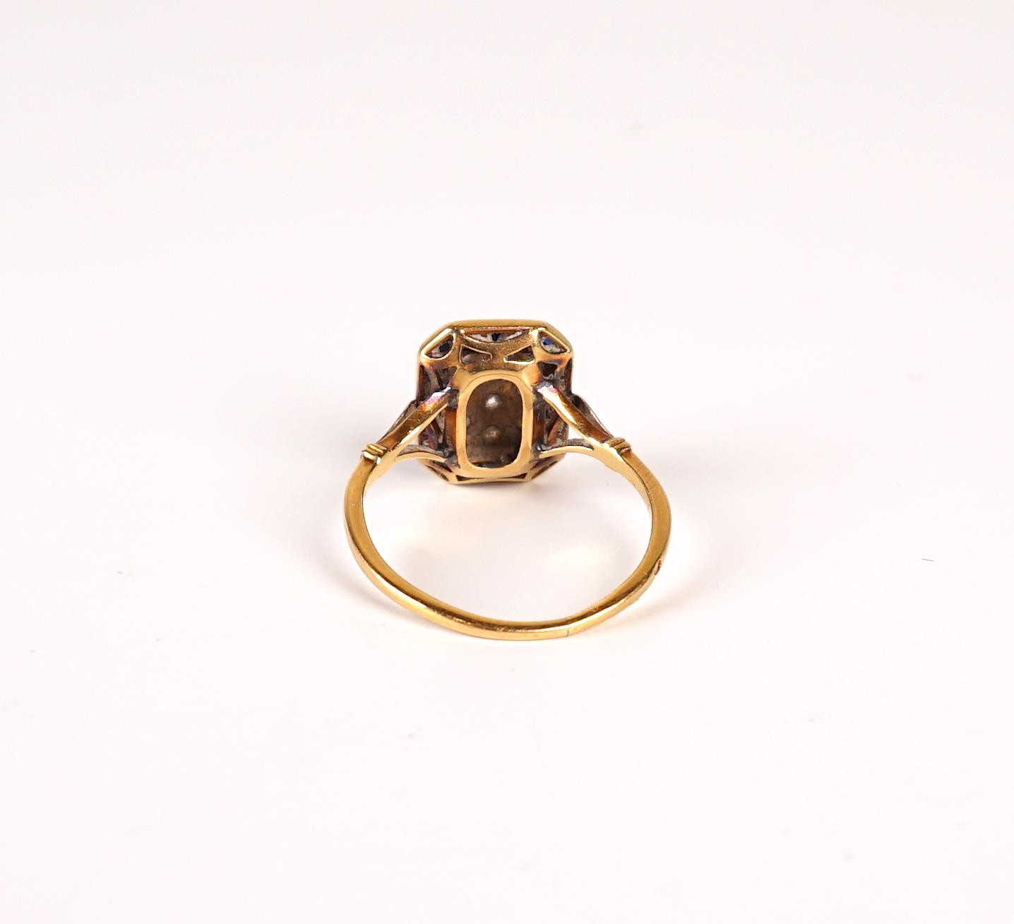 Parure en or jaune 18 K (750/oo) ornée de petits diamants et de saphirs calibrés, comprenant une paire de boucles d'oreille retenant un motif rond, H. 3 cm (pas de diamant sur les attaches : manques ou travail "illusion"?), et une bague rectangulaire. TDD 55. Poids brut : 6.96 g environ.